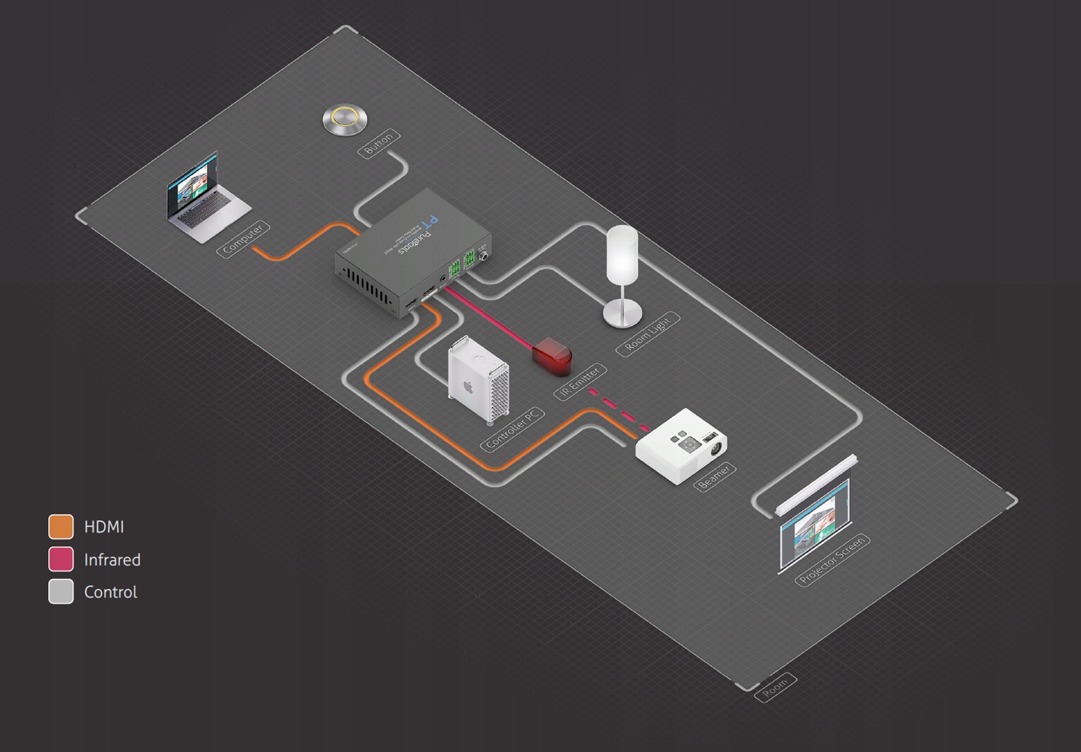 - Преобразование входных управляющих сигналов через HDMI CEC, датчик или вход RS-232 в отдельный CEC. и ИК-сигналы.