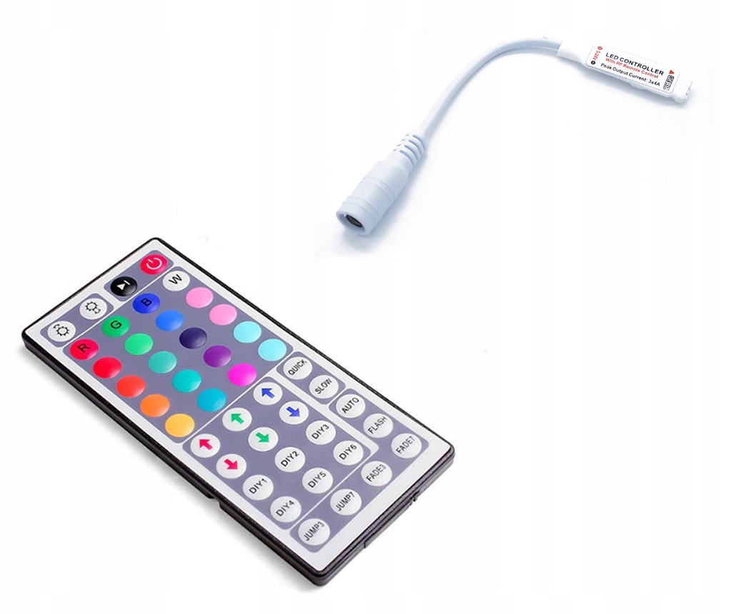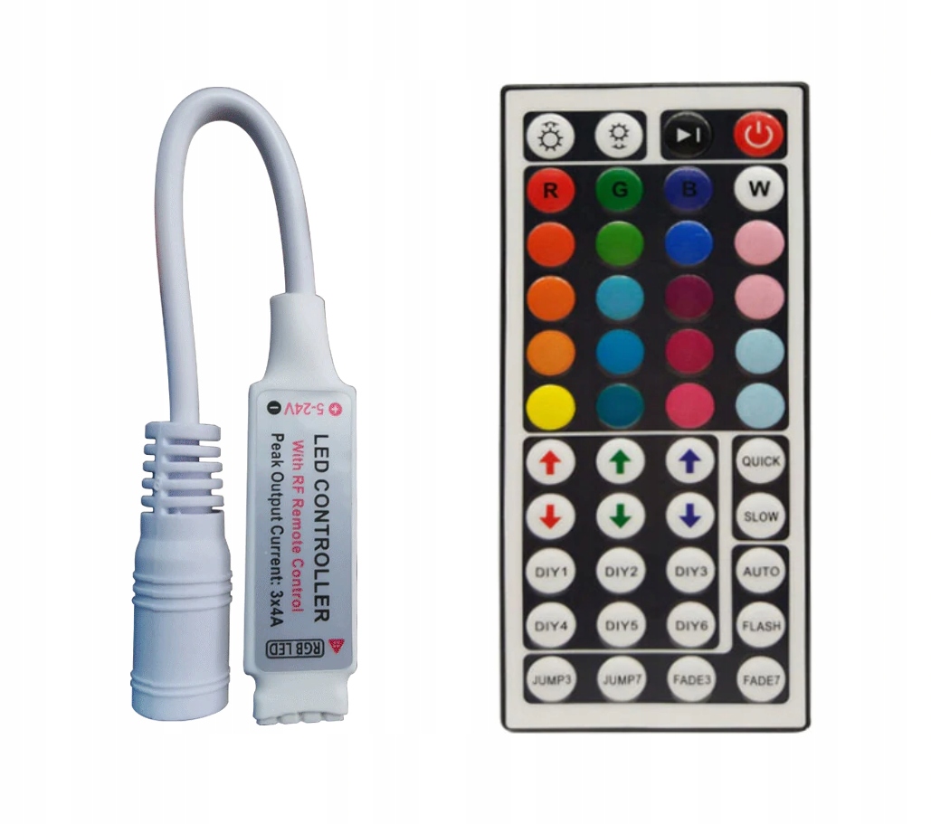 Контроллер с пультом дистанционного управления для управления освещением светодиодной ленты RGB. Возможность изменения цветов, динамических режимов, регулировки скорости и яркости. Благодаря связи между пультом и контроллером посредством радиоволн нет необходимости направлять пульт на контроллер.