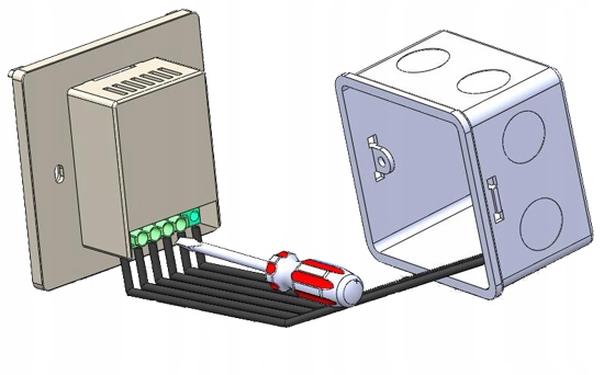 Поместите исполнительный модуль контроллера в электромонтажную коробку и прикрутите заднюю часть корпуса основной панели двумя винтами.