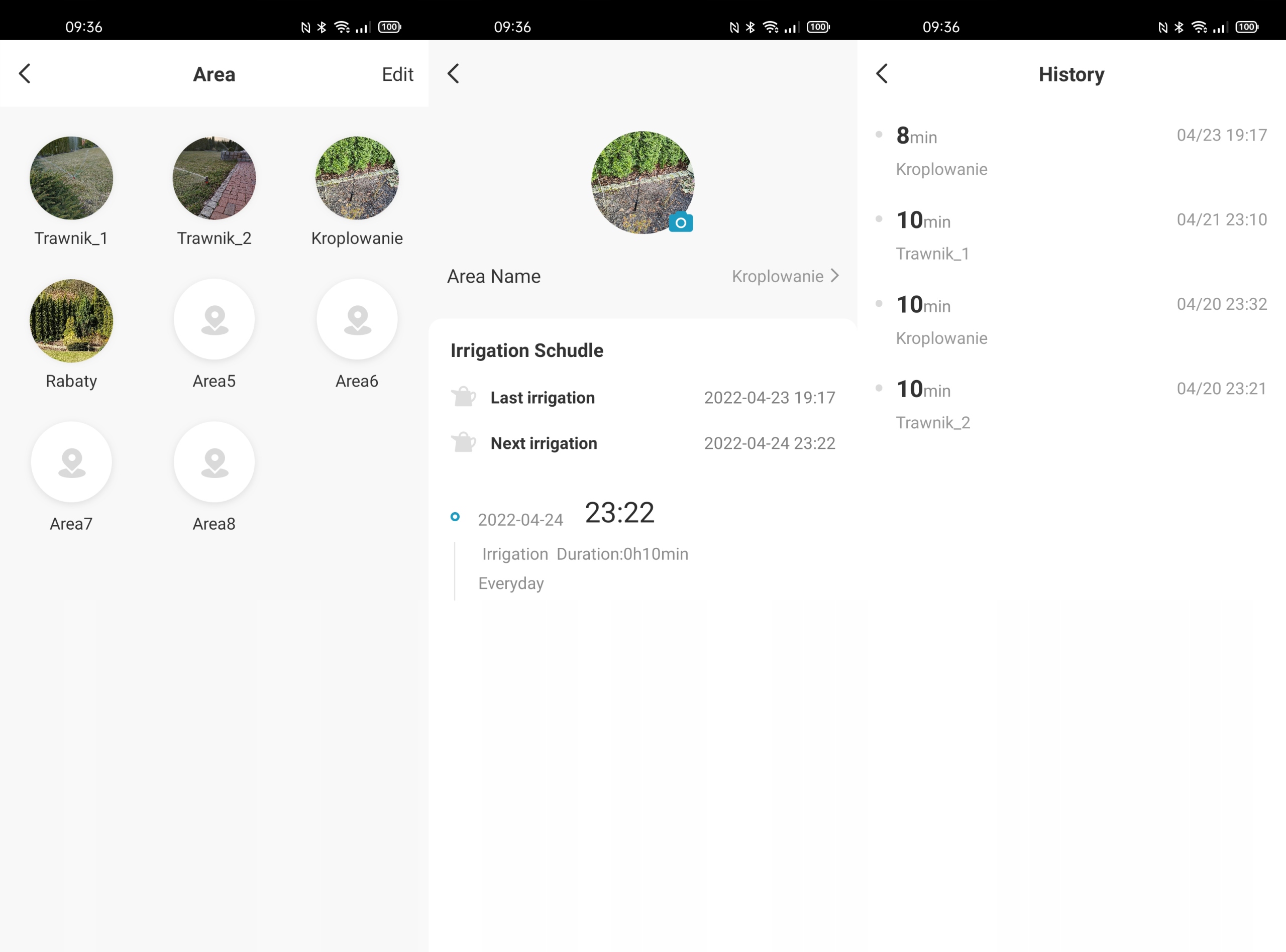 Экран приложения запланирован График на следующие 24 часа b>, что позволяет легко контролировать предстоящие ирригационные циклы. Кроме того, приложение показывает обратный отсчет до конца полива в определенной зоне, которая позволяет постоянно отслеживать деятельность ирригационной системы. сад.