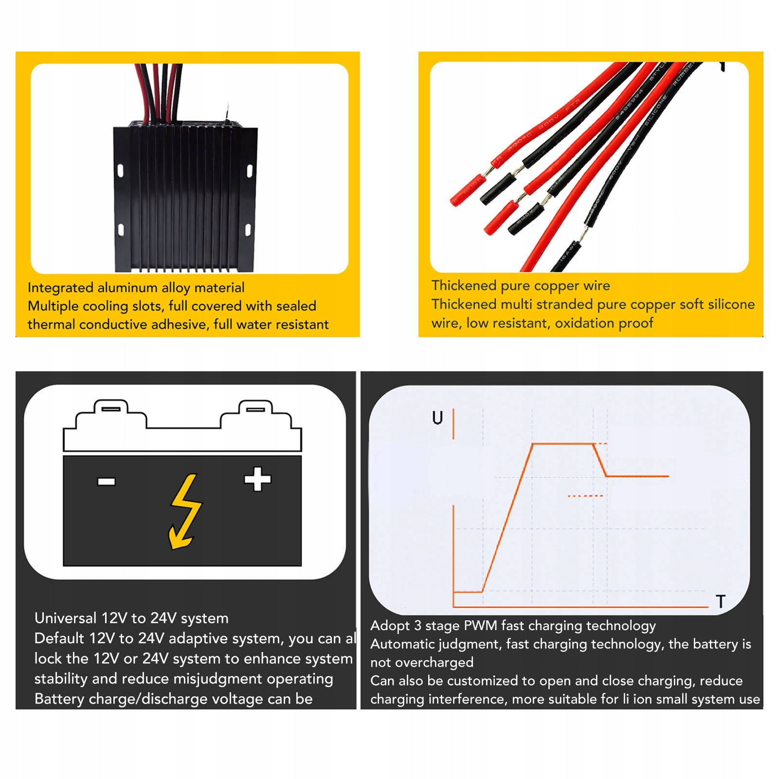 1. Универсальная совместимость батареи: совместимая с батареями 24 В 24 В, ионными батареями 3S 6S и батареями LFP 4S 8S. Он содержит функцию Bluetooth для реального мониторинга и регулировки параметров контроллера через приложение для смартфонов Android.