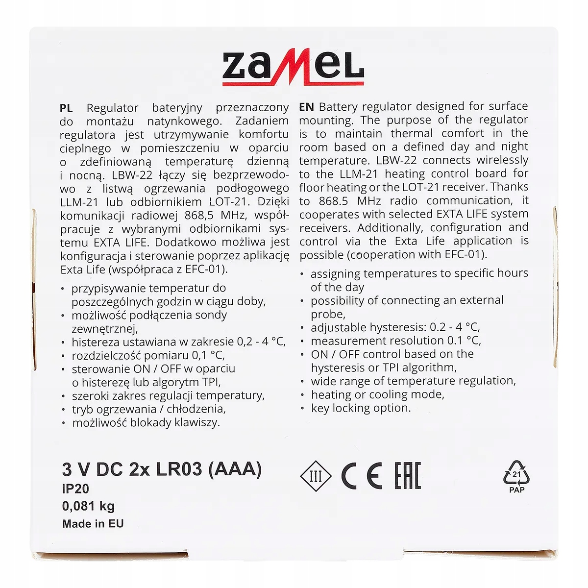 Регулятор батареи, предназначенный для монтированного монтажа. Задача регулятора состоит в том, чтобы поддерживать тепловой комфорт в комнате на основе определенной дневной и ночной температуры. LBW-22-CZN подключается к беспроводной связи с полосой нагревания LLM-21 или приемника LOT-21. Благодаря радиосвязи 868,5 МГц, она работает с выбранными приемниками Exta Life. Кроме того, можно настроить и управлять применением EXTA Life (сотрудничество с EFC-01).