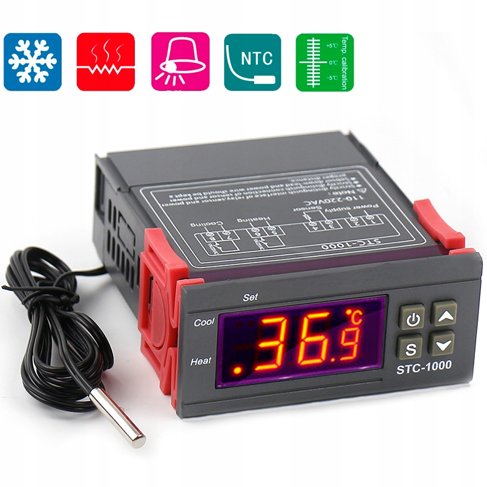 Универсальный терморегулятор STC-1000 используется при работе насосов центрального отопления, циркуляционных насосов, вентиляторов, холодильников, печей, бассейнов, коптилен, везде и многих подобных устройств. Он оснащен четким светодиодным дисплеем и водонепроницаемым датчиком с кабелем длиной около 1 м.