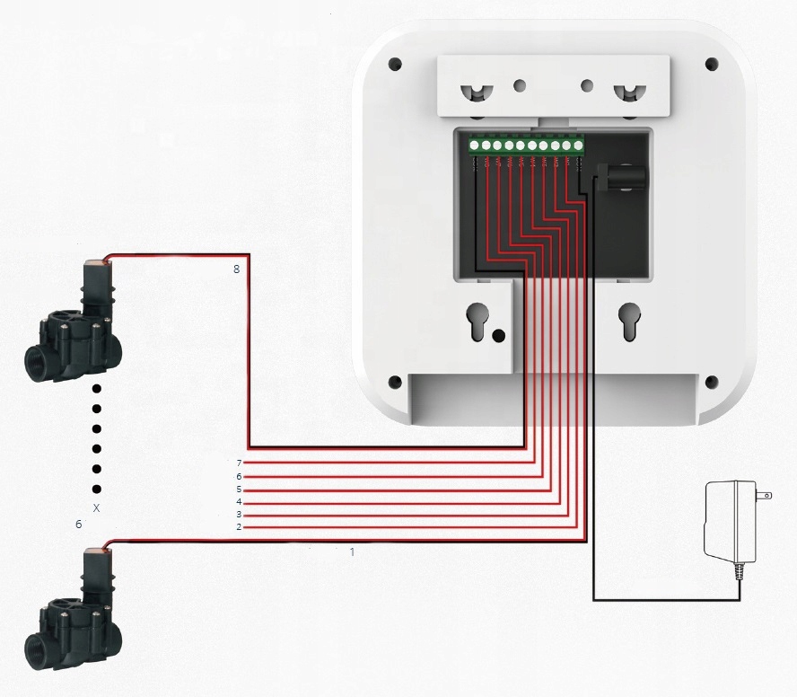 Второй кабель из соленоидных клапанов - индивидуально - мы подключаемся к выходу контроллера, отмеченной зоной (от 1 до 6, в зависимости от количества соленоидных клапанов)