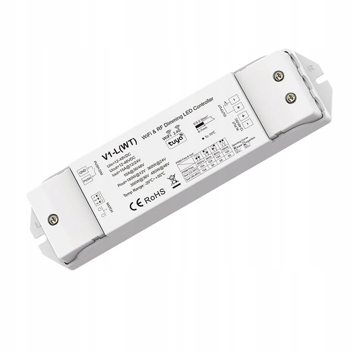 v1-lwt-это контроллер, использующий беспроводную сеть Wi-Fi, предназначенную для регулирования монохромного освещения (например, светодиодная полоса) через приложение Tuya на смартфоне. Функция темных, включающая в себя поддержку/выключение, регулировку яркости, задержку в освещении/выключенном свете, запуск таймера или сцены редактирования. Интересным решением является голосовое управление через Amazon Alexa, Google Assistant, Tmall Genie или Xiaoda, работающие в облаке. Необязательно, вы также можете управлять радио 2,4 ГГц (светодиодный дистанционное управление) или подключаться к внешней кнопке Molsmaging. Предлагаемый контроллер обеспечивает плавное затемнение 0-100% с 4096 уровнями затемнения. Пользователь может выбрать из выходной частоты PWM 500 Гц, 2 кГц, 8 кГц или 16 кГц, а также линейной или логарифмической кривой погружения. Каждый контроллер V1-LWT также может действовать как преобразователь WiFi-RF. Кроме того, он характеризуется широким диапазоном напряжения питания 12-48VDC и может быть загружен с выходным током до 15А. Полное описание устройства, доступного на прикрепленной каталоге карты производителя.