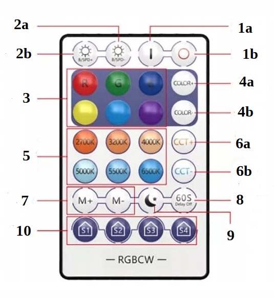 5, 6 – Вы можете выбрать температуру белого цвета, используя предоставленные предложения (2700 – теплый белый , 6 500K - холодный), или с помощью кнопок CCT+/CCT- по отдельности вы создадите идеальный белый цвет!