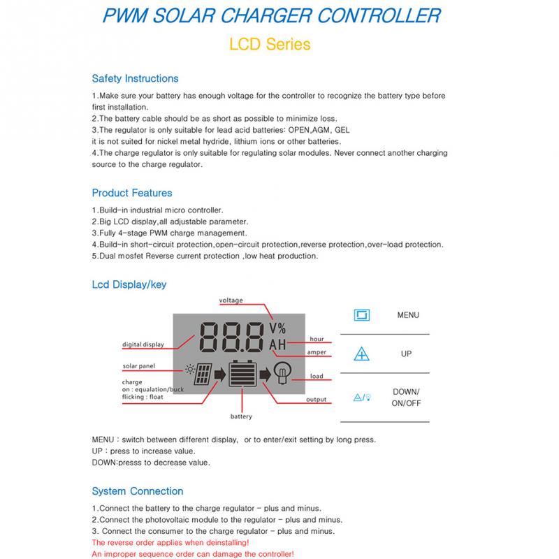 На дисплее контроллера можно наблюдать текущее напряжение зарядки аккумулятора и задавать/выбирать режим работы с гелевыми, кислотными и AGM аккумуляторами, а также вручную программировать настройки напряжения и время переключения выхода.