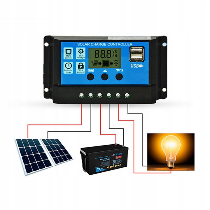 Регулятор имеет задачу преобразования энергии, подаваемой от панелей, в батарею. Защищает от перезаряда аккумуляторов и чрезмерного разряда приемников, подключенных к регулятору.