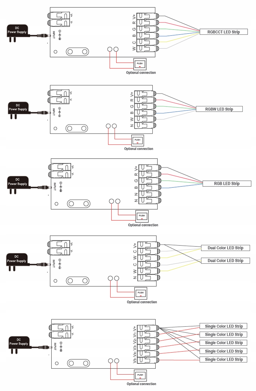 - 5 режимов работы - RGB CCT, RGBW, RGB, CCT, DIMM.