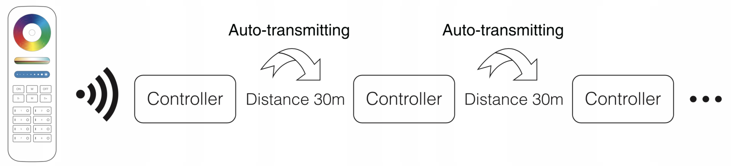 Зоновые приемники позволяют создавать любую комбинацию светодиодного освещения. Можно программировать до 1 пульта 4 или более приемников RGBW и отдельного управления без каких -либо помех