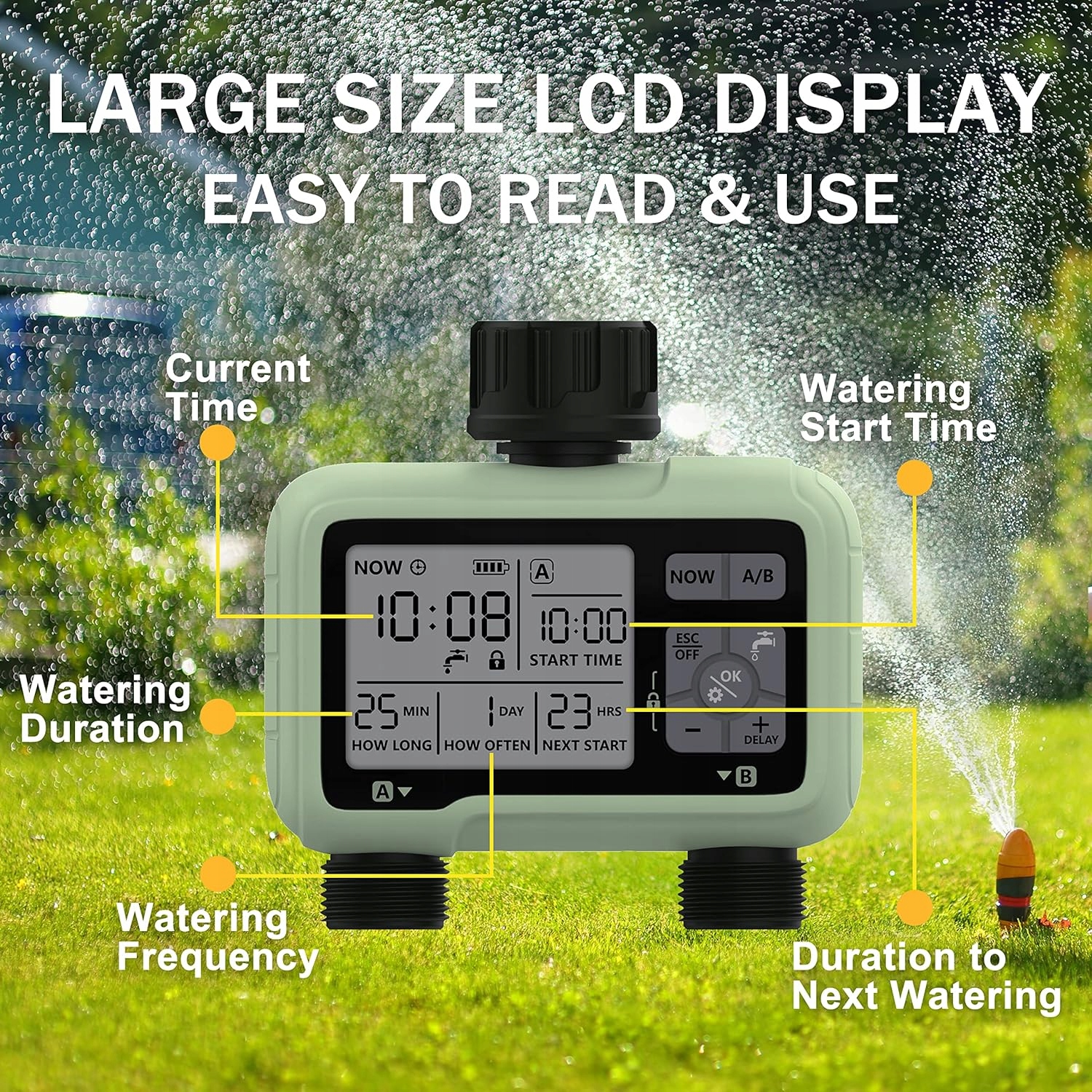 Многофункциональный таймер разбрызгивателя. Таймер полива оснащен настройкой задержки дождя, поэтому вы можете экономить воду, не прерывая график полива. Ручной режим полива. В случае засушливой погоды вы можете в любой момент включить режим полива. Режим блокировки от детей предотвращает скольжение детей и домашних животных благодаря двойному таймеру.