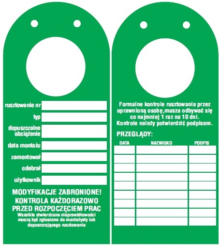 Постоянная маркировка лесов. Система основана на использовании зеленой метки, на которой фиксируются проверки оборудования и разрешения на работу. Строительные леса, не допущенные к работе, отмечаются красной биркой. Индикаторы изготовлены из высококачественного пластика, устойчивого к механическим повреждениям, химическим веществам и УФ-излучению. Индикаторы содержат всю необходимую по закону информацию и место проведения следующих еженедельных проверок. Все, что вам нужно, это 6 зеленых индикаторов на целый год проверок + красная бирка, если леса еще не собраны или не имеют действительных испытаний.