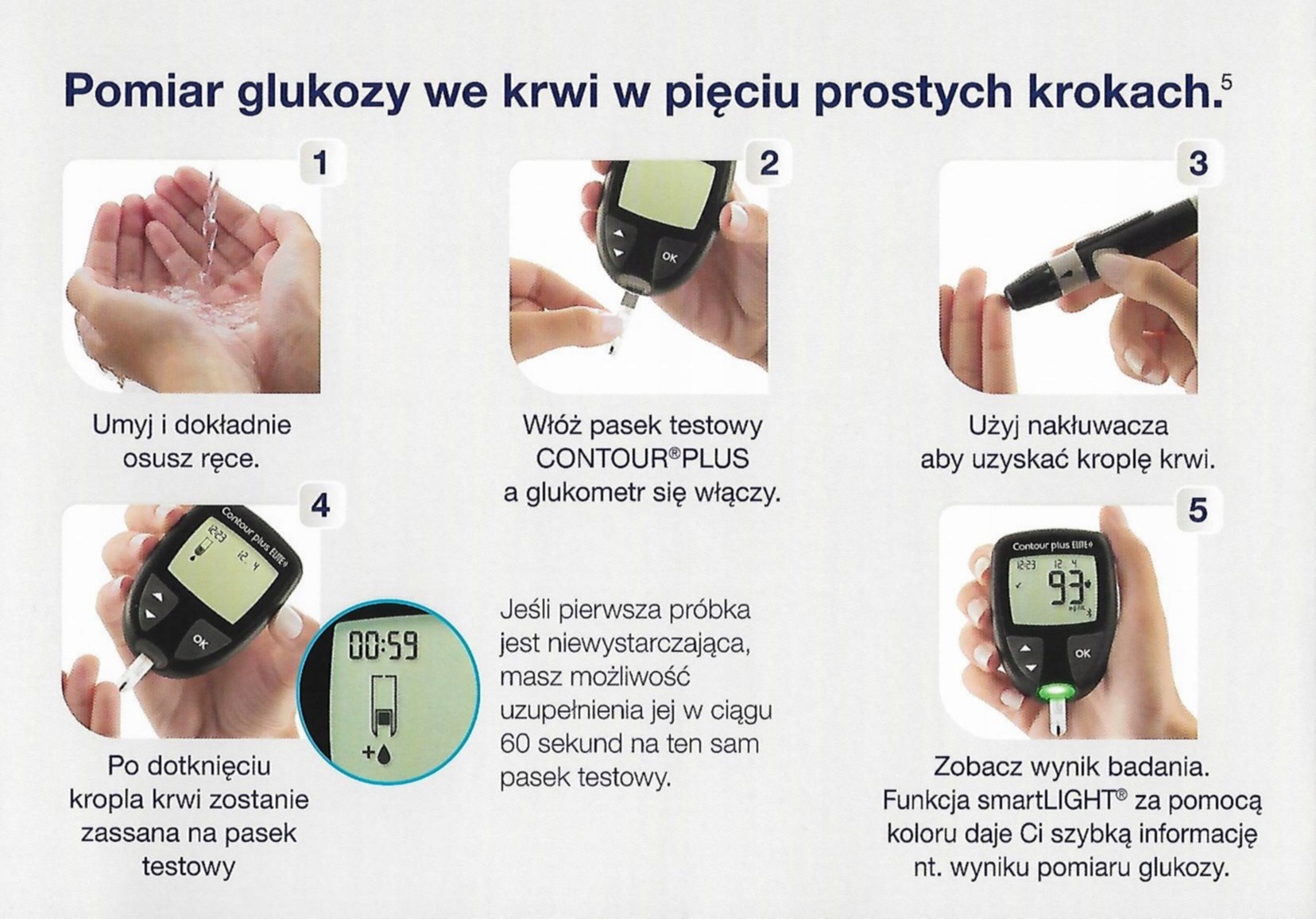 ИНСТРУКЦИИ НА ПОЛЬСКОМ ЯЗЫКЕ (конфигурация устройства, использование прокалывающего устройства и ланцетов, правильное измерение).