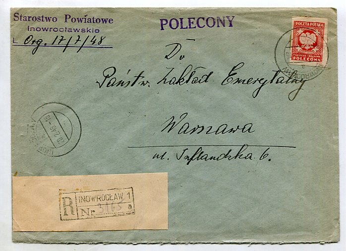 Конверт - заказное письмо - марка РАЙОННОЕ УПРАВЛЕНИЕ ИНОВРОЦЛАВ: 1948 г.