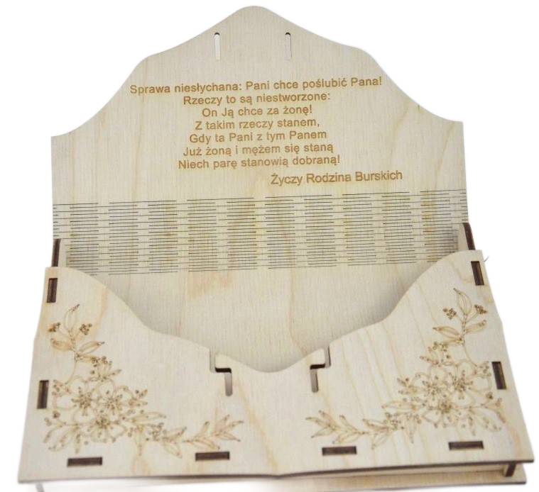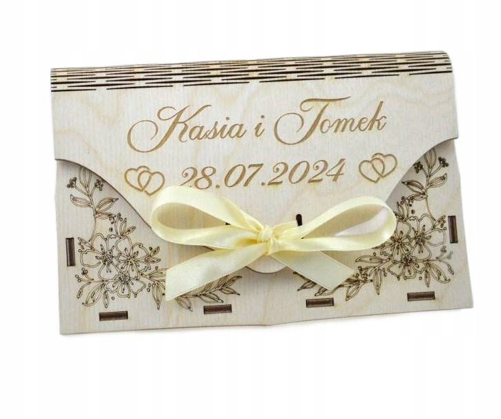 Ищете оригинальный свадебный подарок для своих близких, знакомых или друзей? Этот деревянный конверт специально для ВАС! Изготовленная из высококачественной древесины березы, она обеспечивает долговечность и престижный внешний вид. В комплект входит кремовая лента для закрытия конверта и выгравированные пожелания внутри, чтобы сделать ваш жест еще более личным.