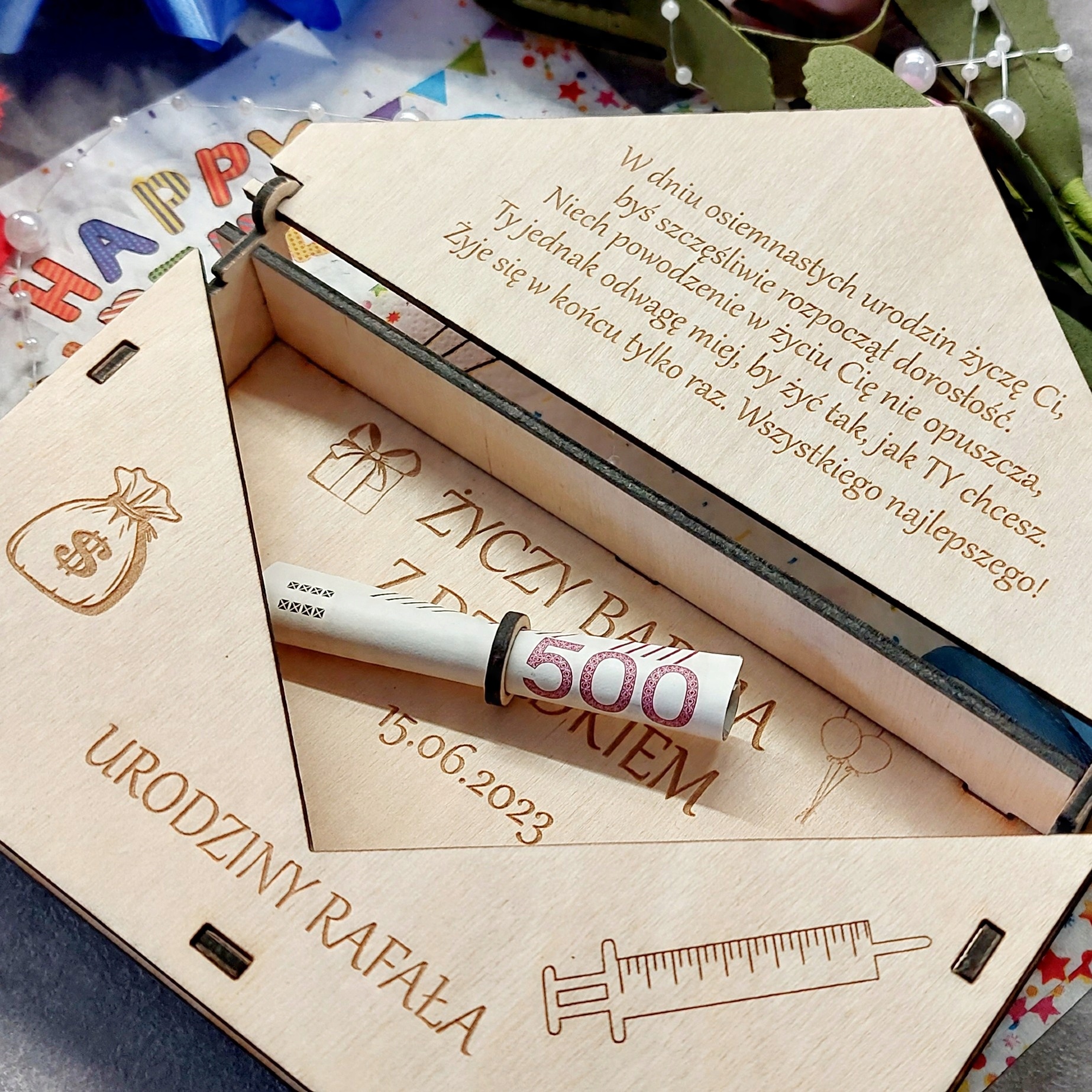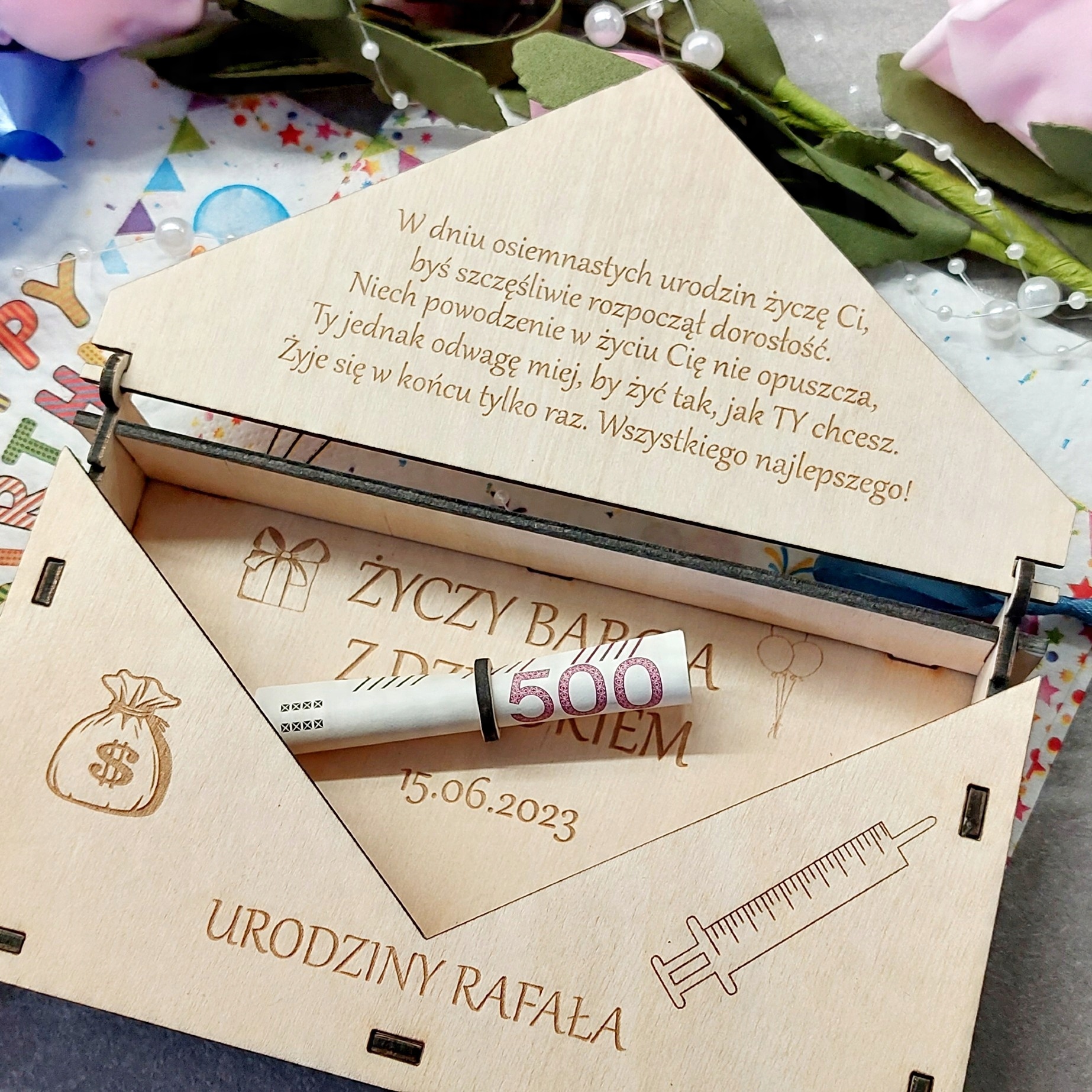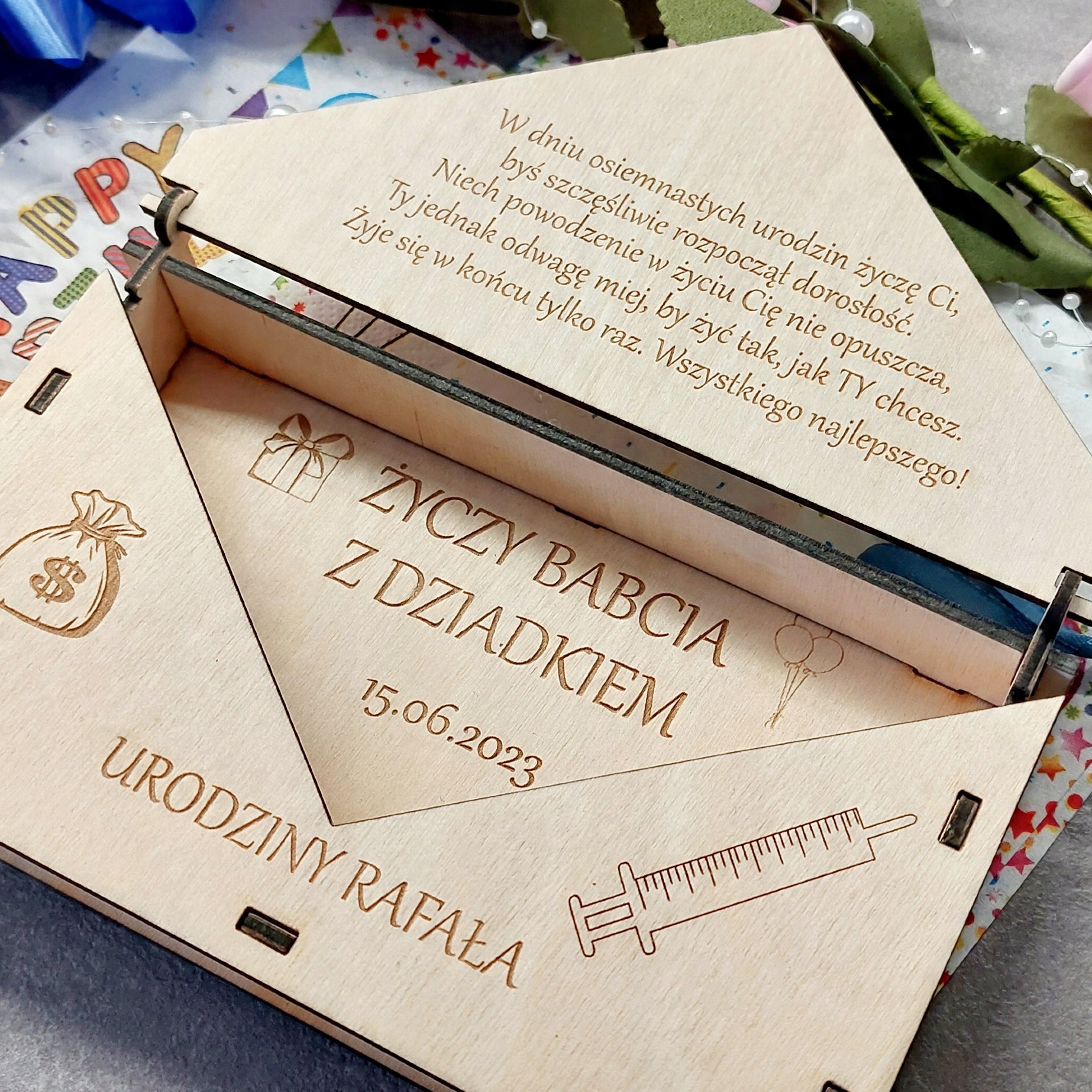ДЕРЕВЯННЫЙ КОНВЕРТ - ДЕНЕЖНАЯ КОРОБКА - ПОДАРОК НА 18-ЛЕТИЕ / 18-ЛЕТИЕ С ПЕРСОНАЛЬНЫМИ ПОЖЕЛАНИЯМИ НА ДЕНЬ РОЖДЕНИЯ