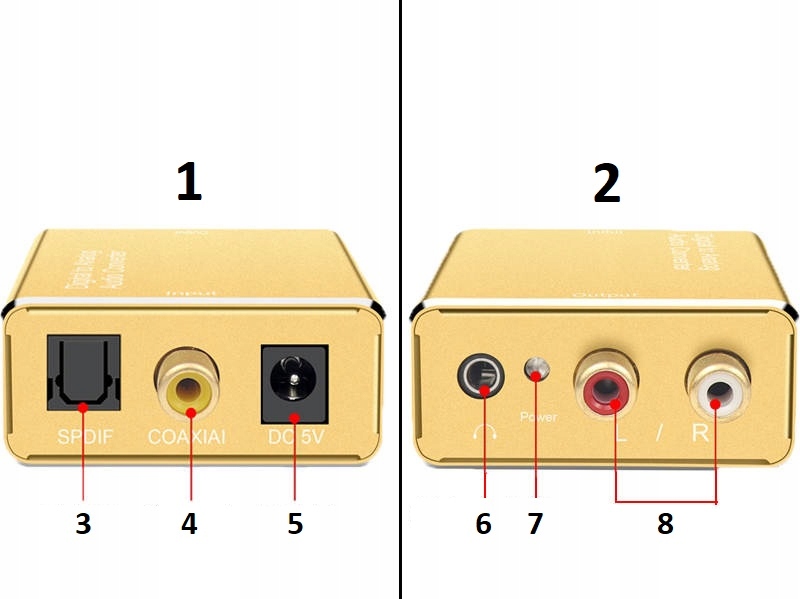 Конвертер позволяет подключать устройства, оснащенные цифровым оптическим аудиовыходом (Toslink/SPDIF) или коаксиальным (телевизор, декодер) , компьютер, ноутбук, приставки и т. д.) для домашнего кинотеатра, ресивера, усилителя, колонок или наушников, оснащенных аналоговым разъемом типа RCA/Cinch или mini-jack 3,5 мм .