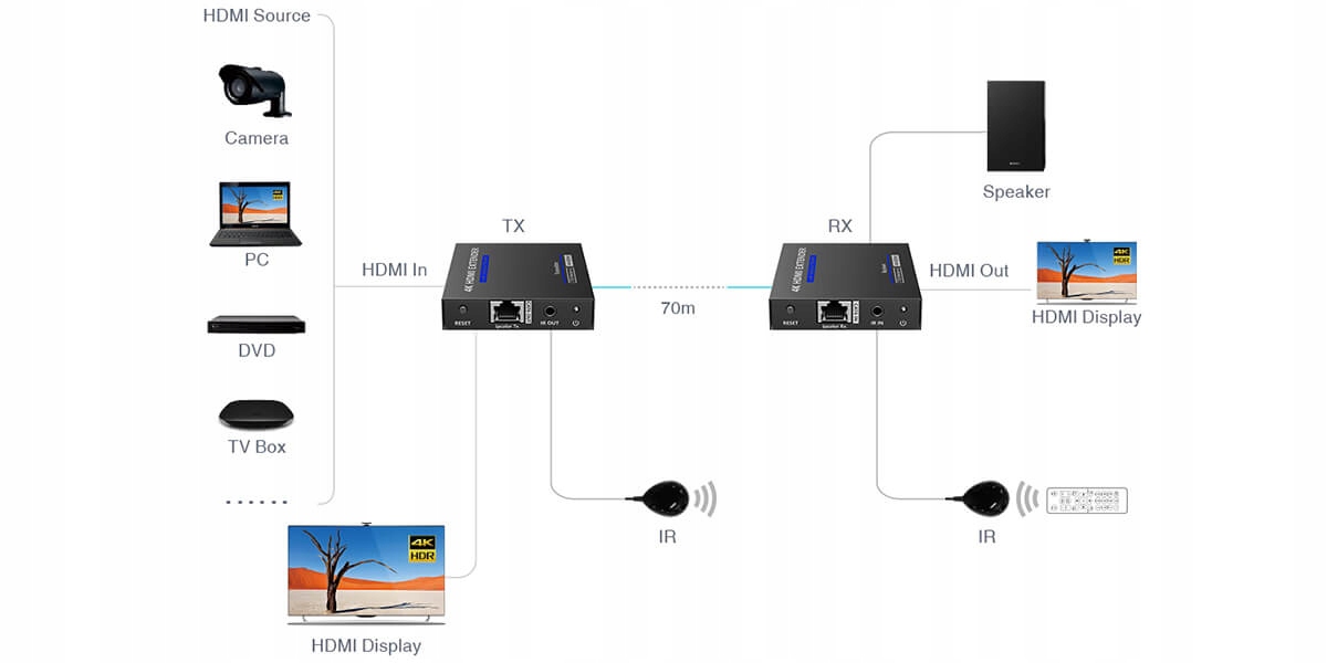 Удлинитель HDMI позволяет передавать и расширять несжатый сигнал HDMI UHD 4K @ 60 Гц по сетевому кабелю CAT6/6A/7. расстояние до 70 метров в разрешении 4К с нулевой задержкой. В комплект входят блок передатчика (TX) и блок приемника (RX), работающие в паре. Устройство имеет функции двусторонней поддержки ИК.