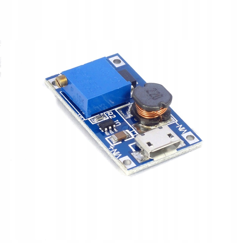 Преобразователь повышающий напряжение в диапазоне от 4В до 28В постоянного тока. Имеет порт micro USB. Плавное регулирование с помощью встроенного потенциометра.