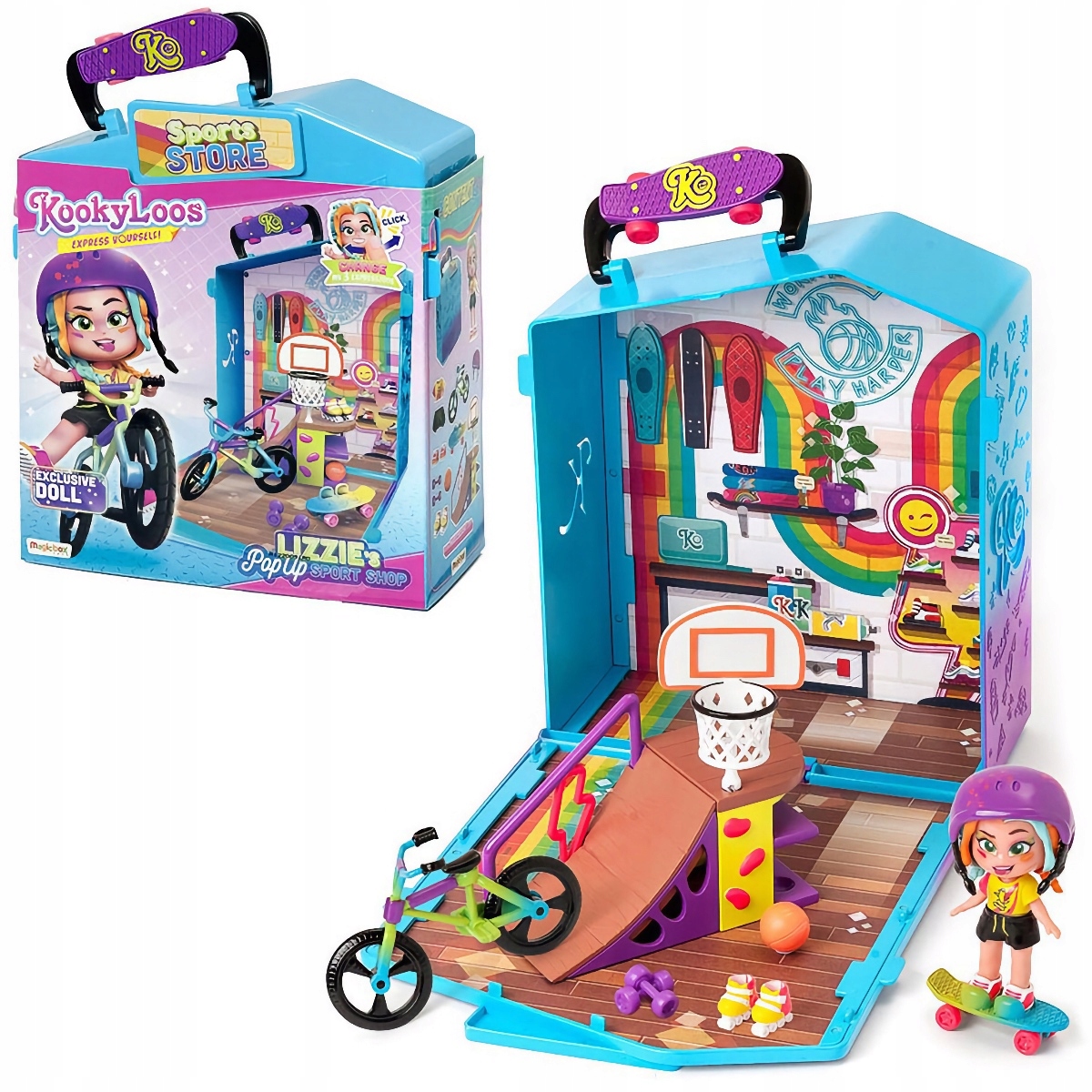 KookyLoos – Pop Up Sport Shop Лиззи – кукла Лиззи и ее портативный спортивный магазин в чемодане