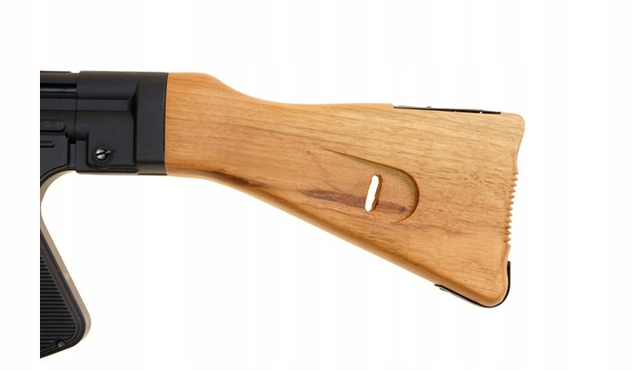 Реплика из металла и дерева. Приклад изготавливался из дерева, остальные внешние детали — из металла. Чтобы подключить аккумулятор, снимите штифт, расположенный в основании приклада, и потяните приклад назад. Есть место для аккумулятора.