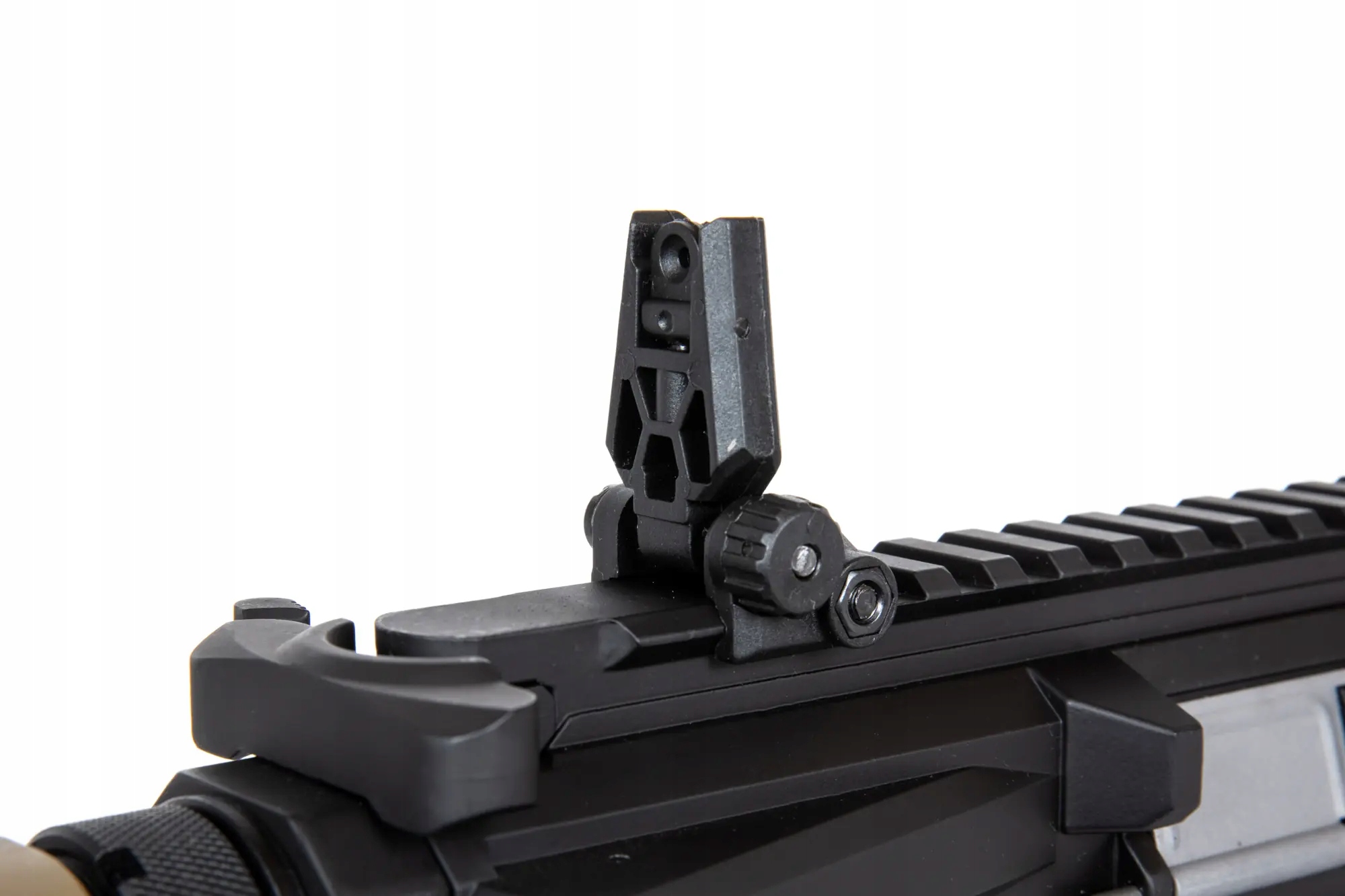 Реплика винтовки SA-E12 оснащена передней частью Free Float. в стандарте RIS/Picatinny, позволяющем устанавливать различные аксессуары - рукоятки, фонарики, лазерные указки или оптические прицелы. Ствол реплики заканчивается дульным устройством, установленным на резьбе 14 мм против часовой стрелки. складные прицельные приспособления размещены на верхней RIS-рейке.