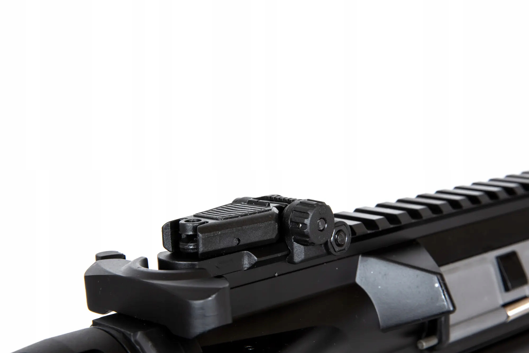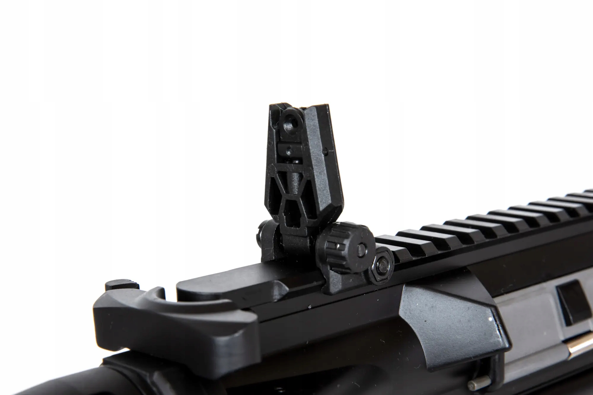Реплика Карабин SA-E08 оснащен передней планкой в системе крепления KEYMOD, на которую можно устанавливать различные тактические аксессуары: фонарики, рукоятки, лазерные указки или оптические прицелы. В комплект входят 3 секции монтажных реек. На длинной верхней планке расположены складные прицельные приспособления. Ствол реплики заканчивается стандартным дульным устройством, закрепленным на резьбе CCW 14 мм.
