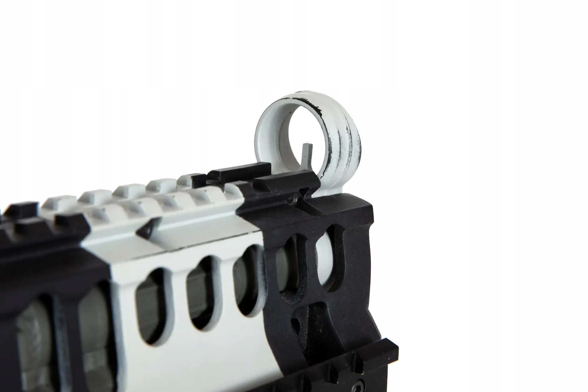 Очень хорошо сделанная и хорошо подогнанная копия пистолета-пулемета. Верхняя часть корпуса реплики, внешний ствол, комплект направляющих RIS и прицельные приспособления выполнены из металла, пистолетная рукоятка и нижняя половина корпуса - из пластика.Небольшие габариты, хороший баланс и общая компактность делают JG202 отличная реплика для схваток на ближней дистанции и соревнований CQB. Эти значения дополнительно усиливаются двусторонним переключателем огня, который позволяет удобно и свободно менять режим огня как правой, так и левой рукой. Важно отметить, что механические прицельные приспособления являются полностью регулируемыми.Привод — редуктор v.3 с набором усиленных стальных шестерен, установленных на стальных подшипниках диаметром 7 мм. Также имеется металлическая направляющая пружины с подшипниками, что существенно облегчает работу механизма, и алюминиевая втулка в поршне. Реплика также оснащена двигателем с повышенным крутящим моментом.Набор направляющих RIS позволяет прикрепить к реплике различные дополнительные аксессуары - тактическую рукоятку, лазерный целеуказатель, фонарик и коллиматорный прицел. Это существенно повышает полезность реплики за счет расширения возможностей ее адаптации к различным условиям игры.