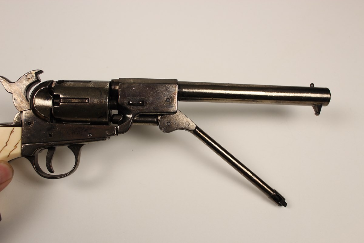 Точная копия прекрасного револьвера Конфедерации. Спусковой и ударный механизм трехпозиционный. Реплика изготовлена из имитации слоновой кости и состаренного металла (цинка). Ствол и ствол черного цвета. Механизм, оснащенный подвижным спусковым крючком и ударником, позволяет производить сухой выстрел.