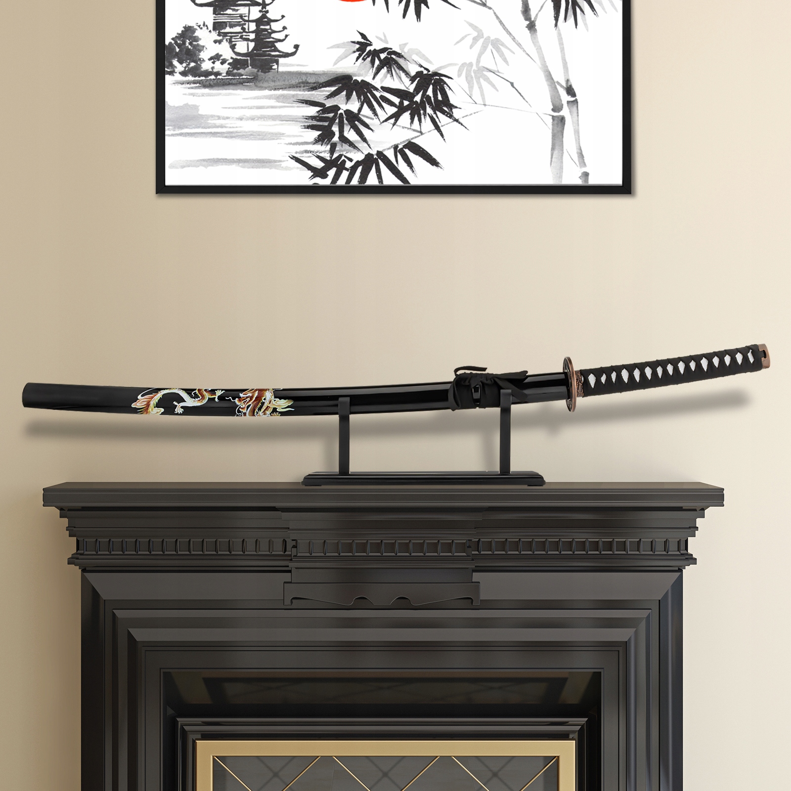 Этот совершенный самурайский меч с ножнами является точной копией катаны с слегка заточенное лезвие. Ножны изготовлены из твердой древесины и украшены мотивом дракона. Это чрезвычайно оригинальное украшение гостиной, столовой и любого другого интерьера. В комплект поставки меча также входит специальная подставка с напечатанным на ней посвящением.