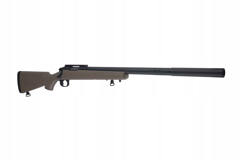 Точная копия снайперской винтовки с пружинным приводом. Имеет четырехзапорный замок, требующий перезарядки после каждого выстрела. Ложа и приклад изготовлены из прочного пластика. Из металла были изготовлены такие элементы, как ствол, спусковая скоба, затвор, колодец магазина и рычаг заряжания.