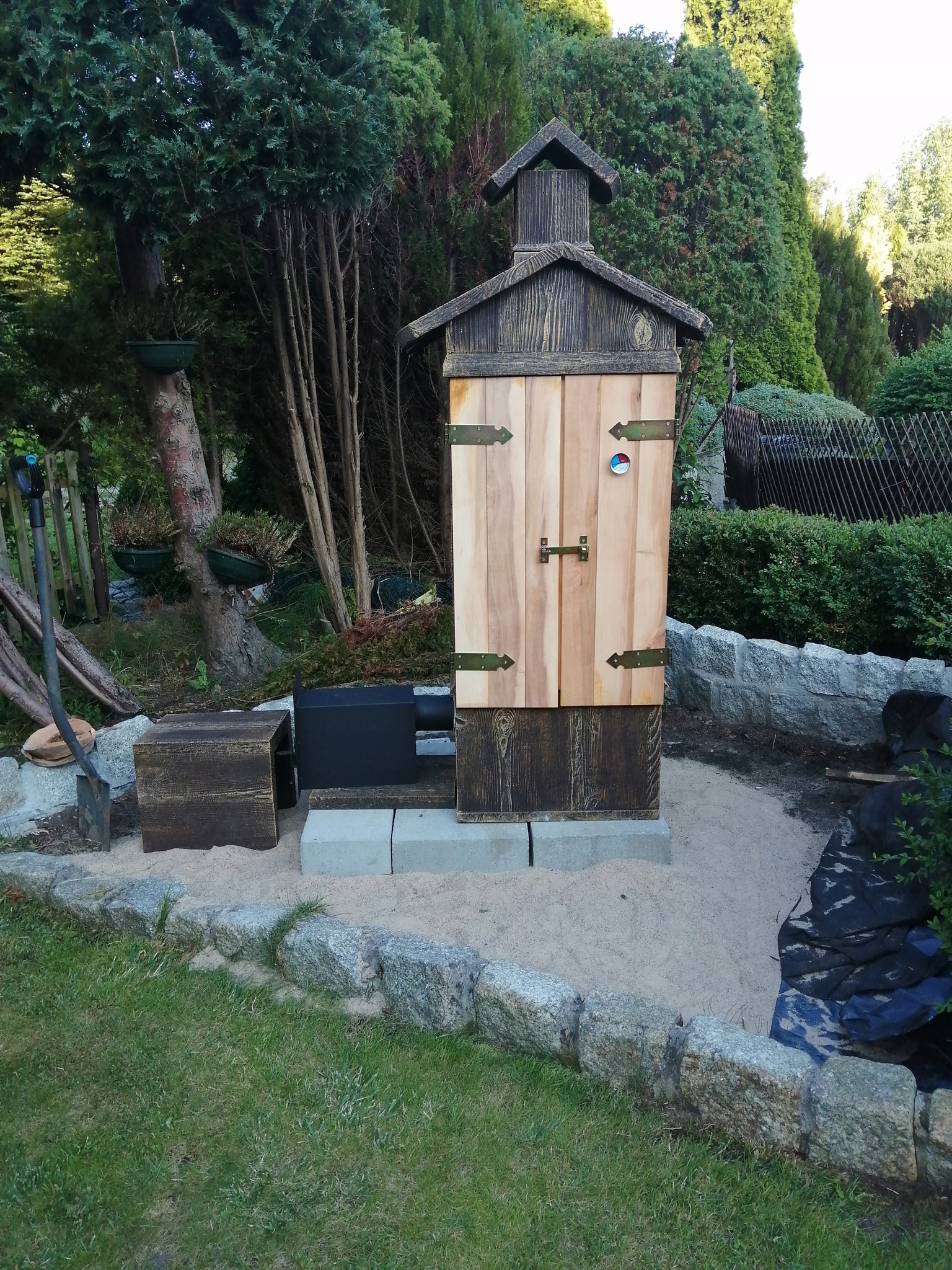 коптильня: высота 188см, ширина: 98см (коптильня 58см, очаг 40см), глубина: 58см
