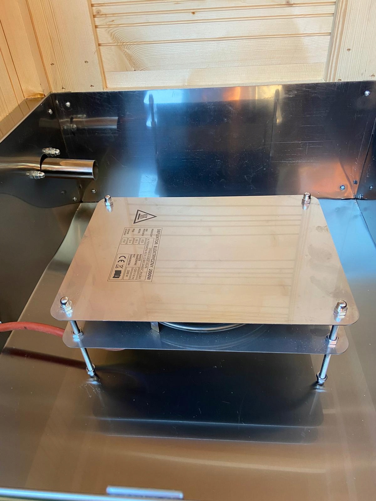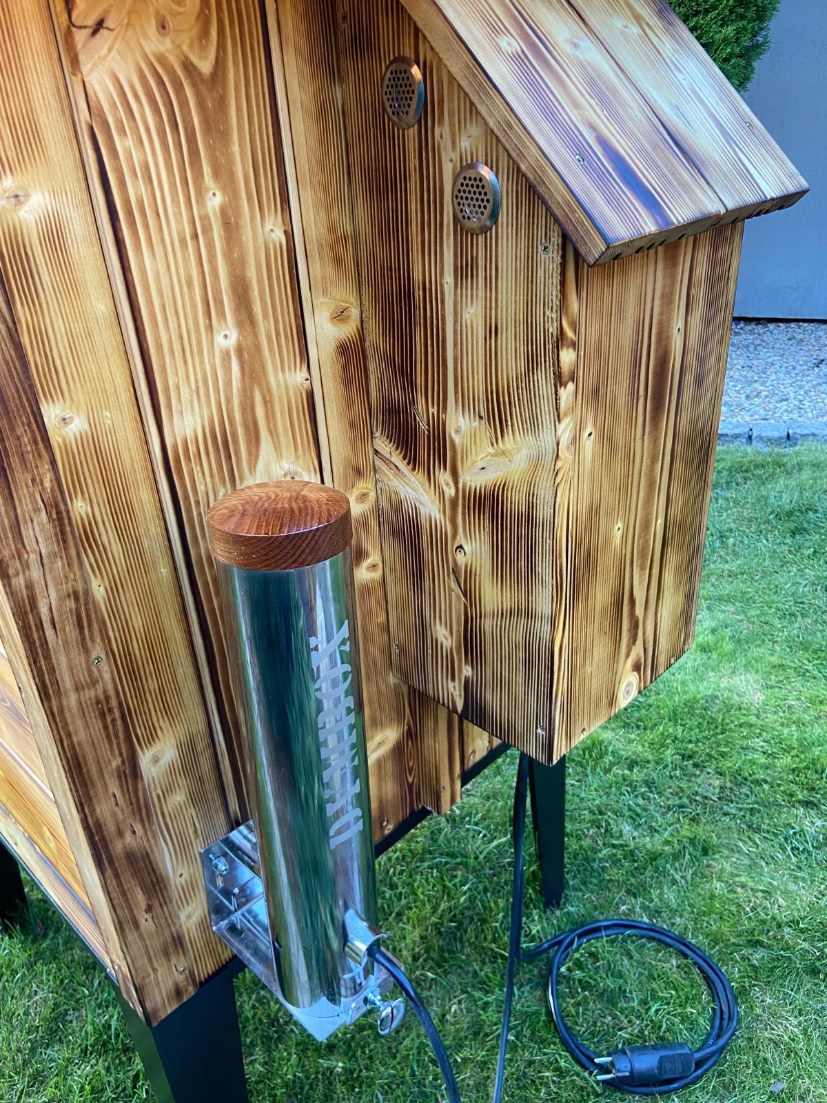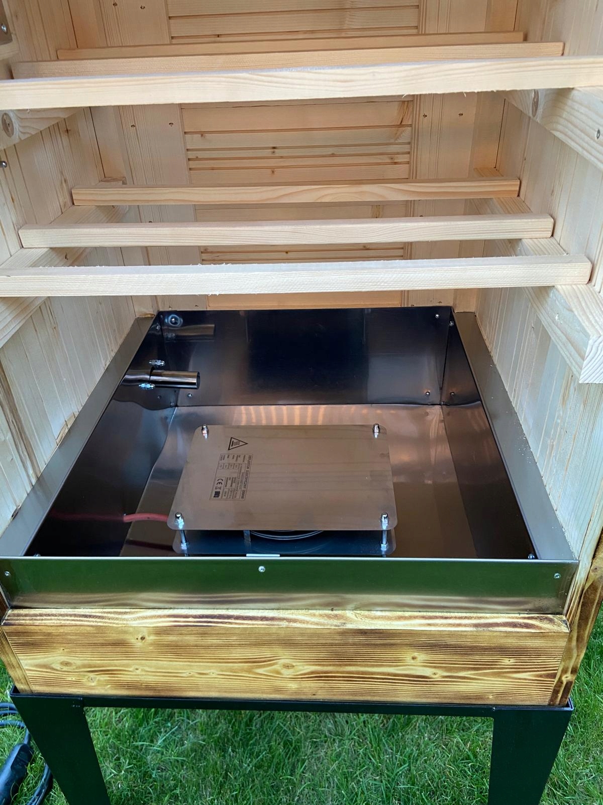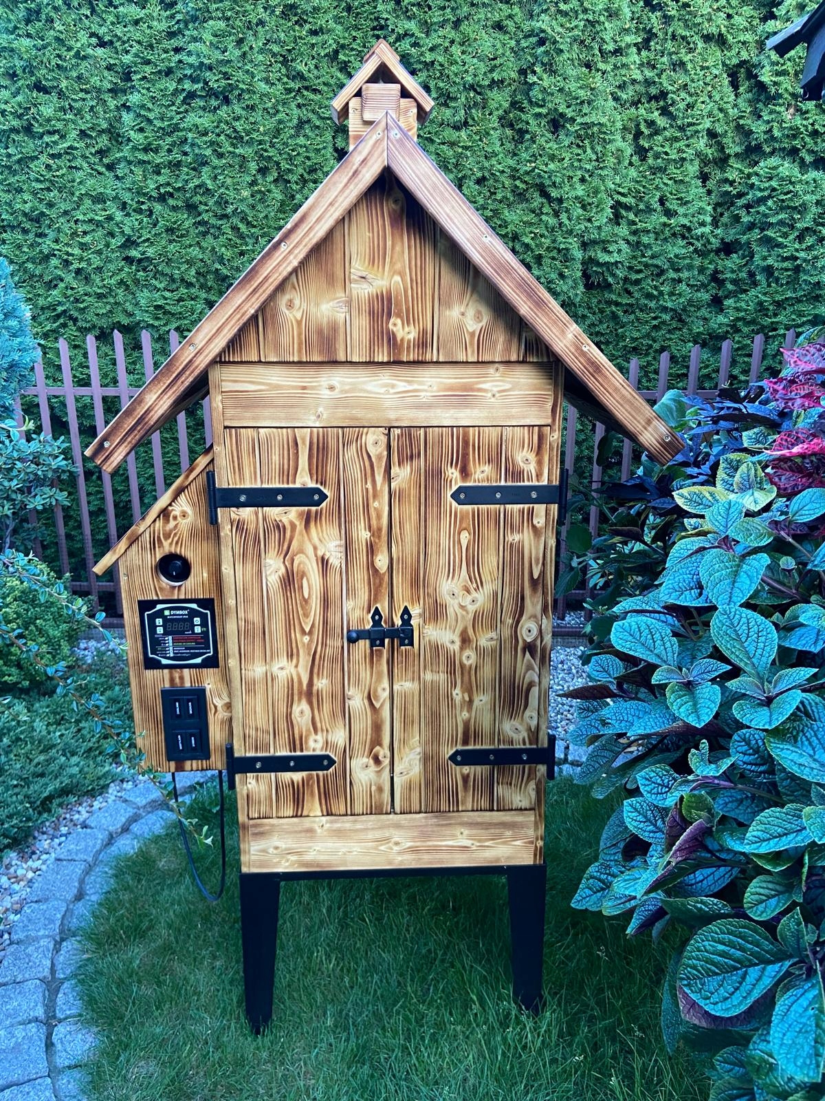 Кабели имеют силиконовое покрытие, устойчивое к температуре до 180 градусов, что гарантирует безопасность и долговечность даже в самых тяжелых условиях. Широкоугольная крыша обеспечивает оптимальную функциональность, а красиво облицованный листовой металл внизу коптильни подчеркивает солидность и эстетику изготовления. Все это дополняется массивными петлями и надежной защелкой, с возможностью выбора направления открывания двери (вправо/влево) – каждая деталь тщательно продумана.