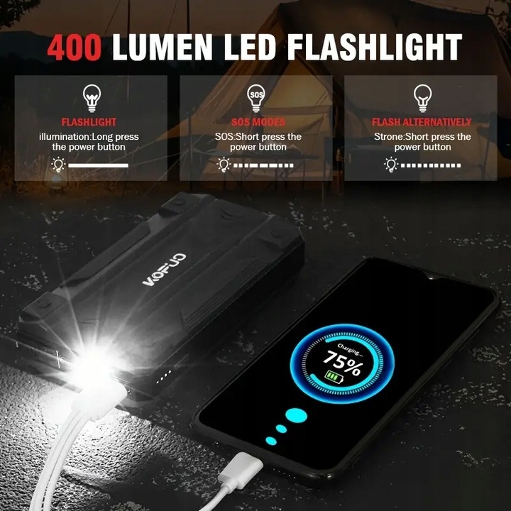 Этот эффективный аккумуляторный стартер также является портативным автомобильным аккумулятором. Встроенные 4 более тонких аккумулятора высокой емкости с 2 выходами USB и входом/выходом Type-C позволяют одновременно заряжать мобильные телефоны, планшеты и другие мобильные устройства в качестве дополнительного источника питания в экстренных ситуациях. Совет: зарядите перемычку с помощью адаптера 5 В/2 А или лучше.