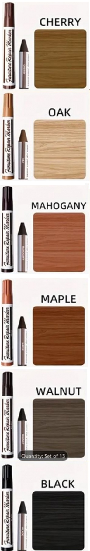 ✅ Функция: Маркеры для ремонта дерева — это инструменты, содержащие цветной жидкий пигмент, обычно на древесной или масляной основе. Их используют для заполнения царапин, вмятин, дефектов или небольших повреждений на деревянной поверхности, придания им соответствующего цвета и выравнивания внешнего вида.