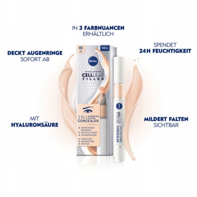 Крем NIVEA Hyaluron Cellular Filler 3in1, корректирующий темные круги под глазами с ГИАЛУРОНОВОЙ КИСЛОТОЙ обеспечивает коже 24-часовое увлажнение, заметно уменьшает морщины и линии на лице, а благодаря содержащимся в нем пигментам покрывает темные круги под глазами, осветляя взгляд. Одного нанесения крема для глаз NIVEA достаточно, чтобы придать им здоровый и красивый вид! Средство имеет удобный спонж-аппликатор, позволяющий оптимально распределить формулу. Толерантность кожи и глаз подтверждена дерматологически и офтальмологически. Также подходит для тех, кто носит контактные линзы.
