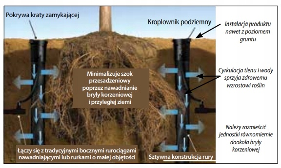 - Аэрация и орошение под поверхностью земли предотвращает «пересадочные потрясения» деревьев и кустарников после пересадки