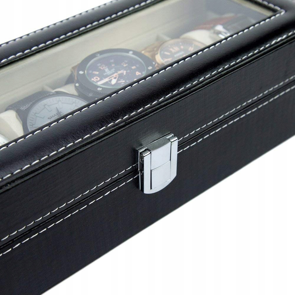 Сплошная, элегантная коробка для 6 часов. Закончено с эко -кожей. Вы можете хранить часы в нем или после удаления украшений подушки или других мелких предметов. Закрыт с защелкой - защищает от случайного открытия и пропасти содержания.