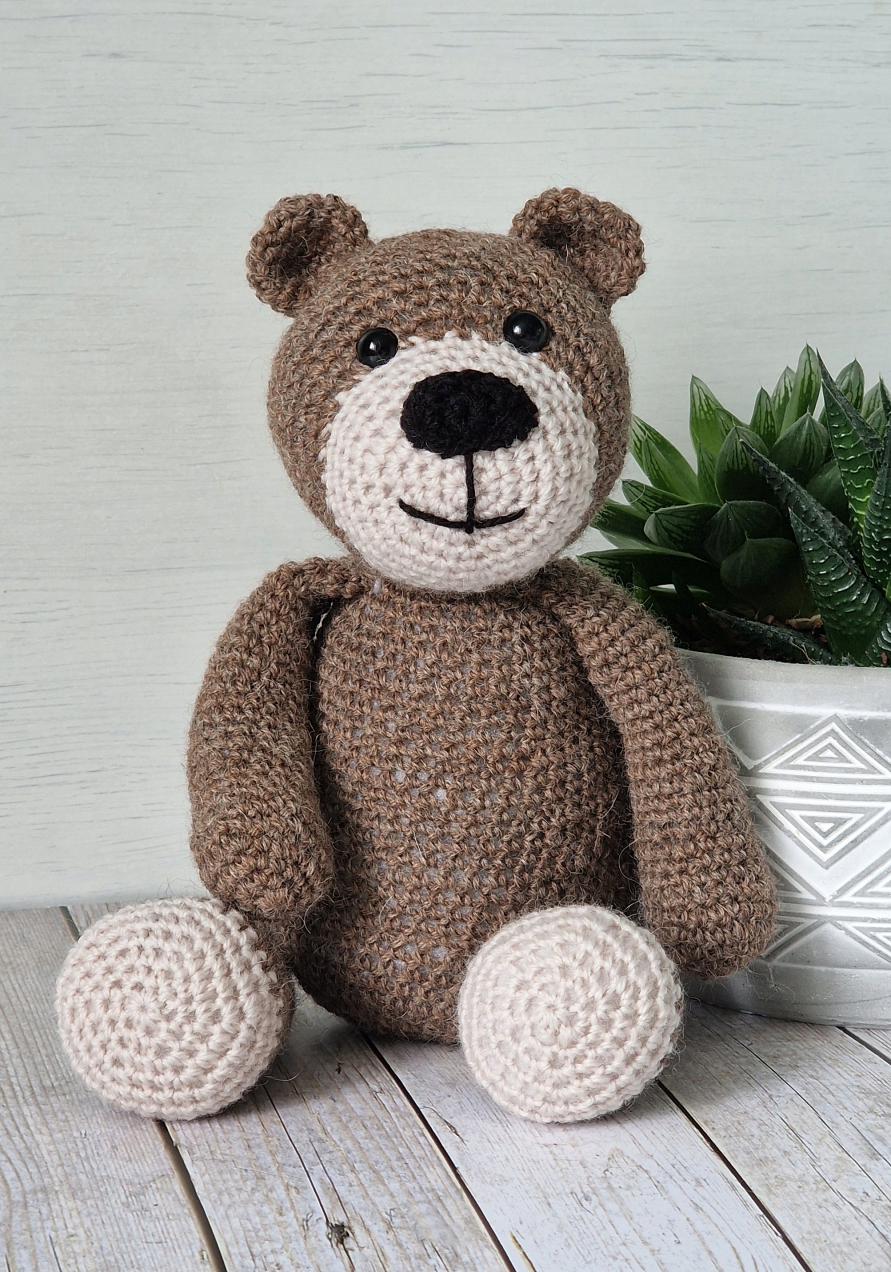 Медведь сделано полностью вручную шерсти и альпаки. Наполнен силиконовым мячом. У него есть безопасные зажимы изнутри. Игрупку можно вымыть вручную в 30 ° С.