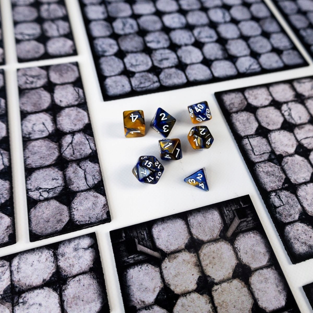 Набор состоит из 16 элементов из прочной резины толщиной 2 мм с односторонним принтом в виде классического рисунка подземелья с четкой сеткой квадратов. Каждый сегмент вписывается в другие в любой конфигурации, что позволяет создавать бесконечное количество планировок комнат и коридоров, идеально подходящих как для запланированных сценариев, так и для сеансов в песочнице. Это позволяет вам динамично строить подземелье, открывая новые области по мере продвижения игроков.