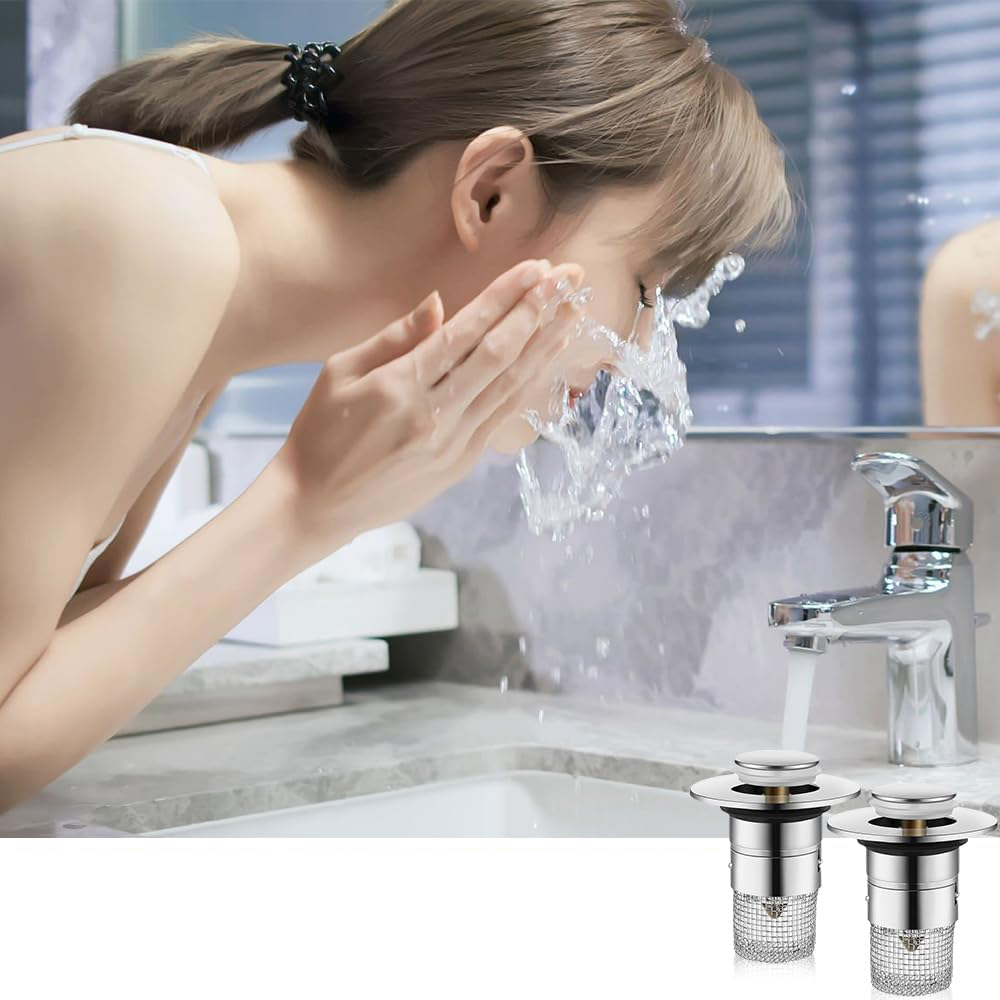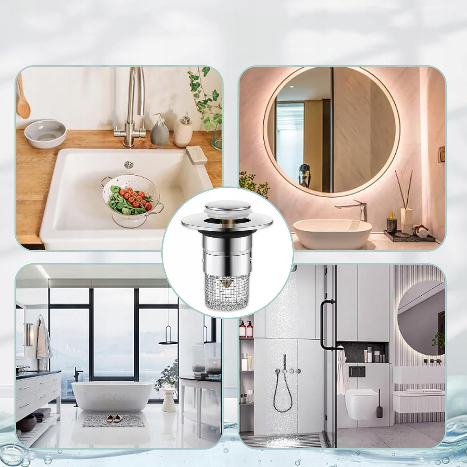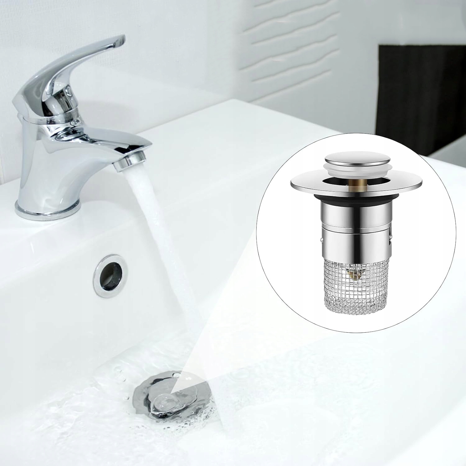💦💦【 Эффективная фильтрация】 Эта продленная заглушка раковины оснащена фильтром, который может фильтровать вещества, содержащиеся в волосах. Защитывание и фильтры - это простое и практическое соединение в одном. Просто нажмите верхнюю крышку, чтобы переключиться между остановкой воды и режимом дренажа воды. С многослойным поверхностным хромом, он долговечен и устойчив к ржавчине, а высококачественное силиконовое резиновое кольце > Просто поместите заглушку из слива триггера в сливное отверстие, чтобы завершить установку. Никаких других инструментов не требуется