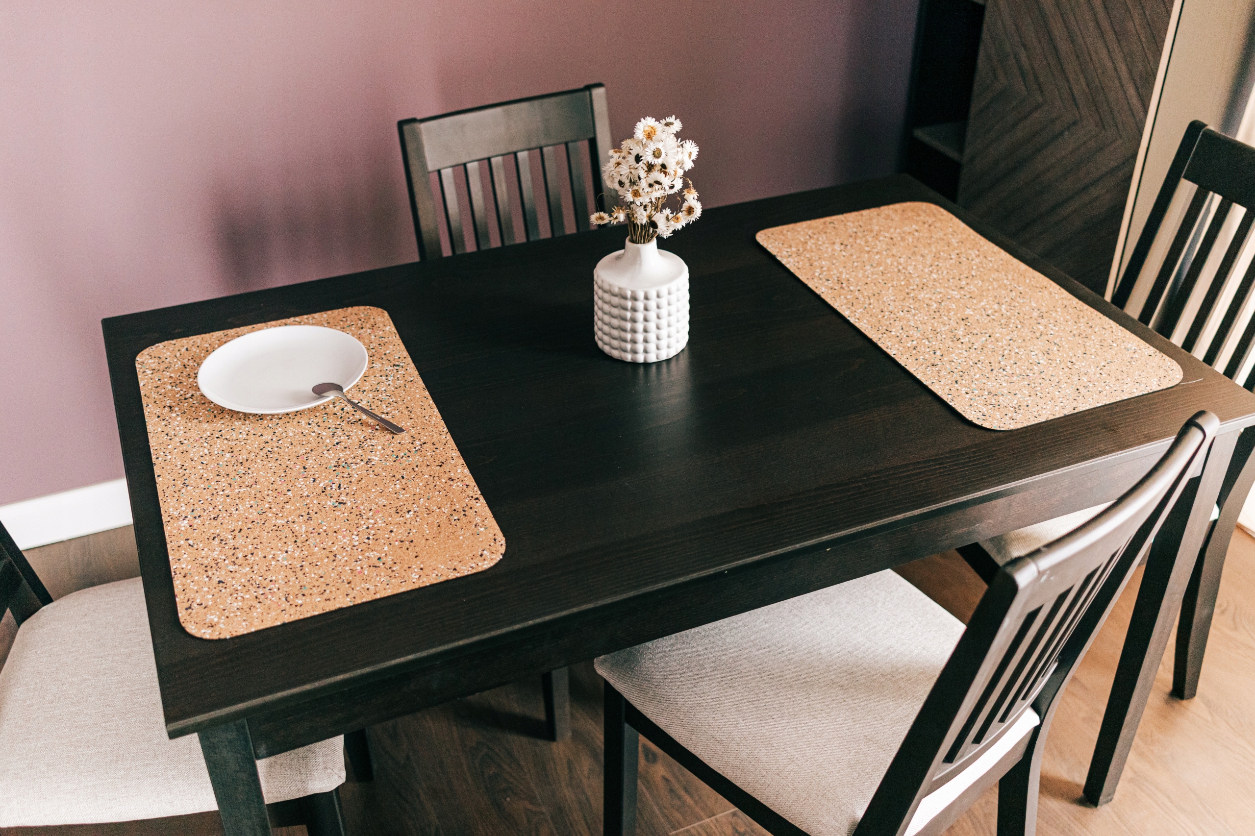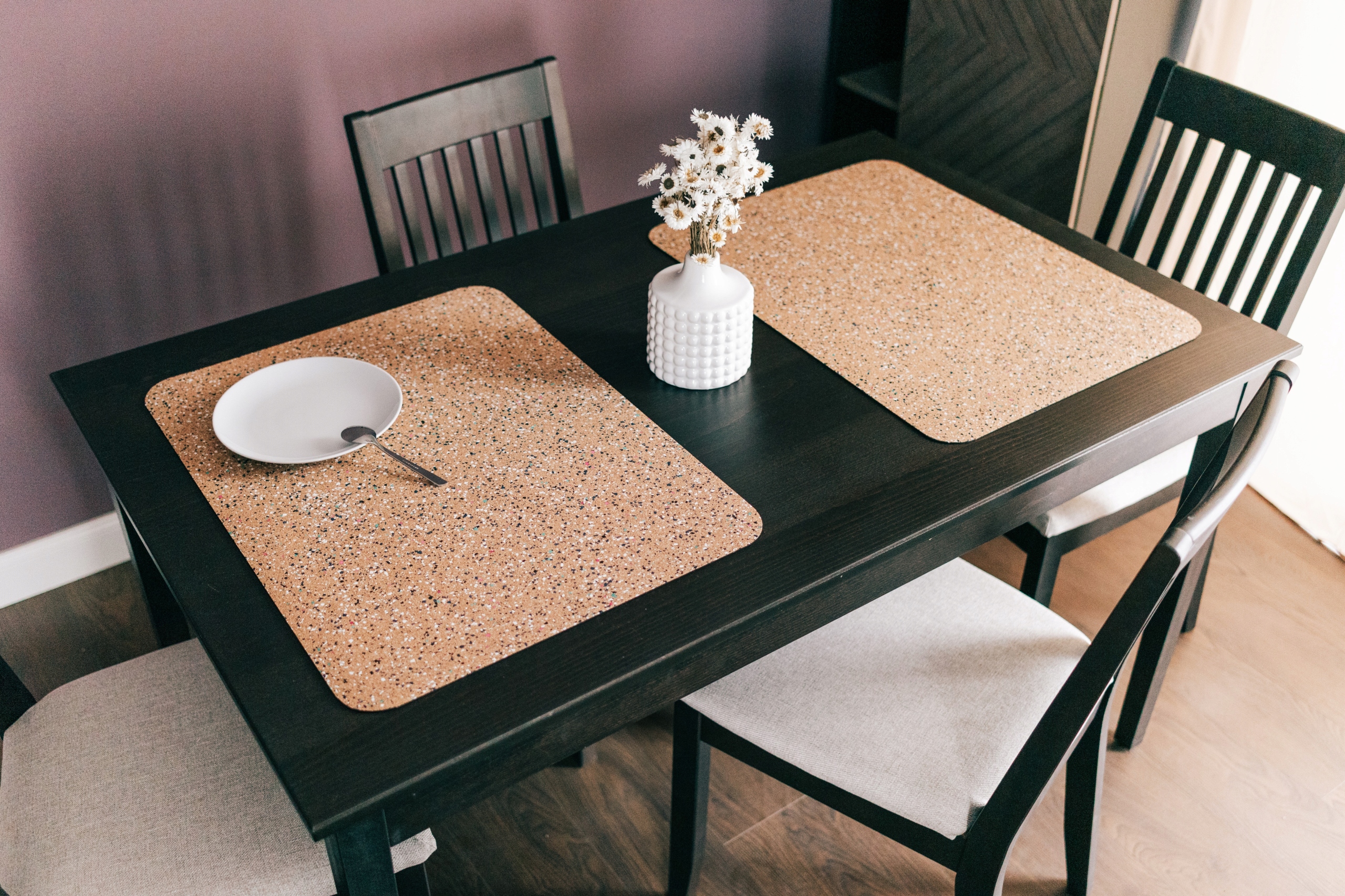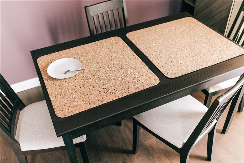 Накладка изготовлена из натурального пробкового материала толщиной 1 мм. Под ним находится черный противоскользящий слой толщиной 2 мм, который обеспечит хорошее прилегание к столешнице или столу и не будет смещаться.