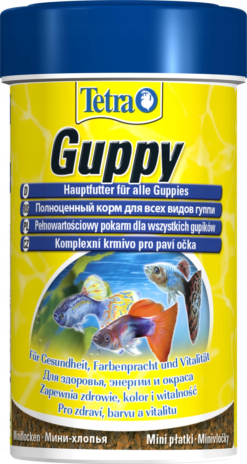 Тетра Гуппи выпускается в форме миниатюрных хлопьев. Корм поддерживает здоровье, цвет и жизнеспособность рыб.