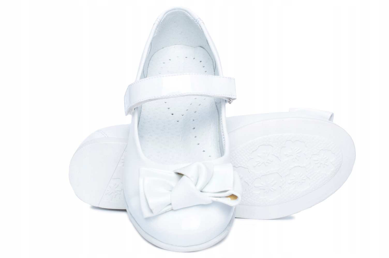 Формальные балетки для девочек от KORNECKI идеально подходят для празднования Первого Причастия, для производства использована качественная экологическая кожа, внутри обуви использована мягкая натуральная кожаная подкладка. Стелька кожаная профилированная, подошва легкая и гибкая, изготовлена из термопластической резины TR, устойчива к истиранию, хорошо держит землю. Туфли могут стать дополнением формального наряда.