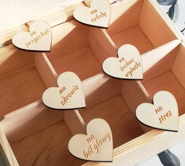 В коробке находится 6 выгравированных сердечек. Вы можете воспользоваться нашими предложениями или предоставить свои собственные пароли. В базовом наборе присутствуют следующие надписи: