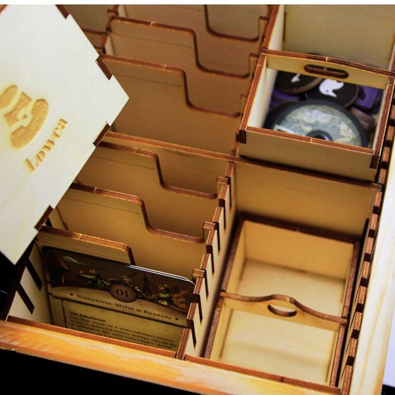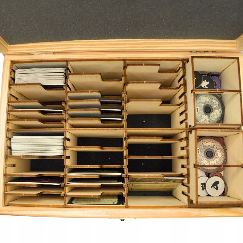 Внутренняя часть коробки была закончена с элегантной пеной, которая защищает элементы от повреждения и предоставляет им соответствующую организацию. Вдумчивая система перегородков позволяет удобно разделять карты Ведьма и охотников, что значительно улучшает подготовку к игре. Кроме того, в соответствии с вашими потребностями до 24 деревянных перегородков. Закрытие коробки является прочной и простым в использовании, что гарантирует безопасность хранимых предметов