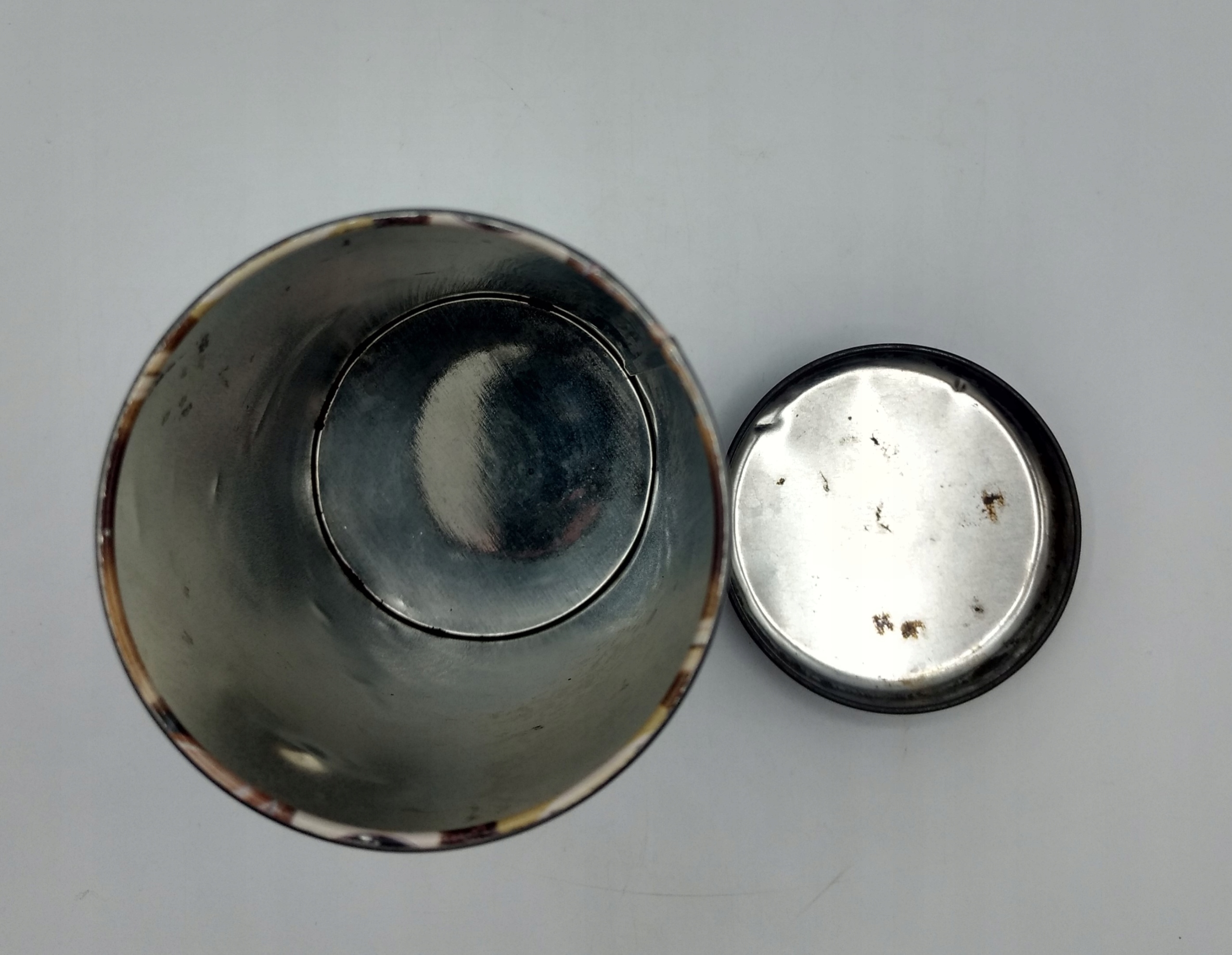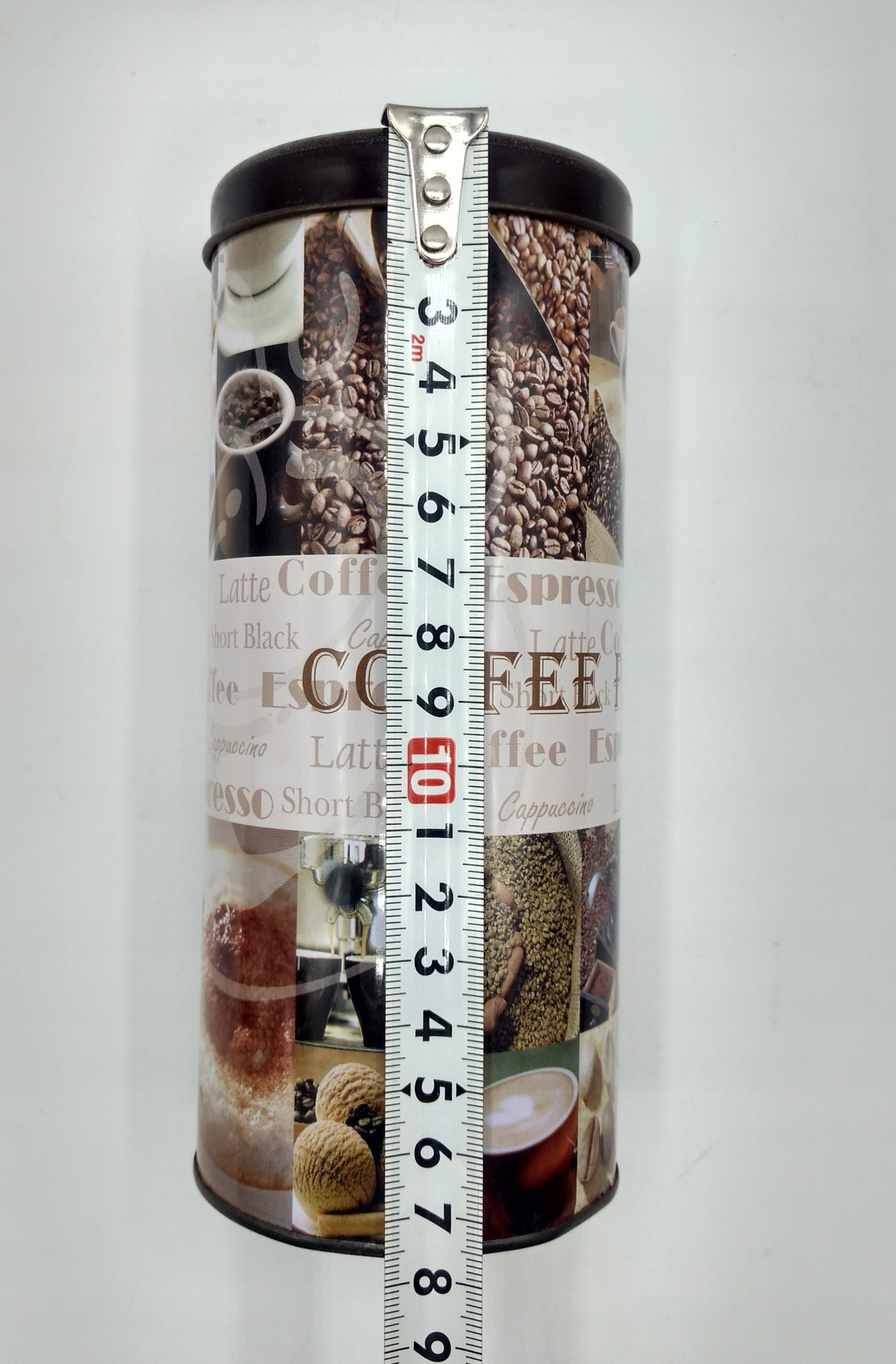 - предмет старый и его видно, кое-где есть микровмятины, царапины, следы коррозии, но это только добавляет шарма банке, все это дополняется холодными цветами и "красивым кофейным мотивом"