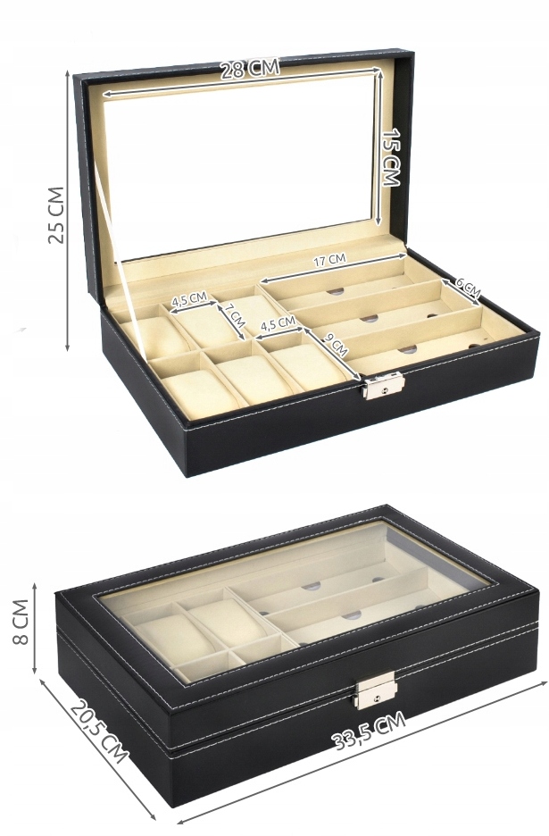 Элегантная шкатулка имеет 3 отделения для очков и 6 отделений для часов, в которые также можно поместить другие украшения. Чехол имеет элегантный черный цвет и белые швы, что придает всему изящество и стиль. Крышка футляра прозрачная, поэтому коробку для часов и очков можно использовать не только для хранения и поддержания порядка, но и для элегантной демонстрации содержимого.