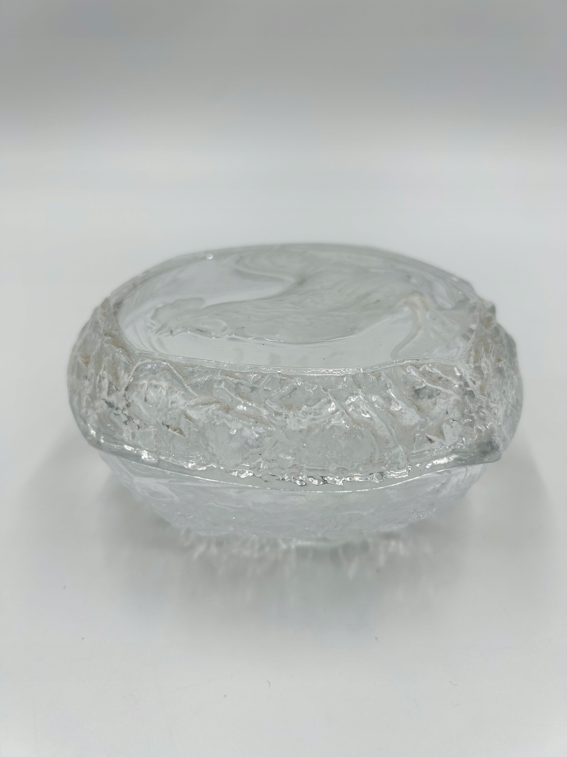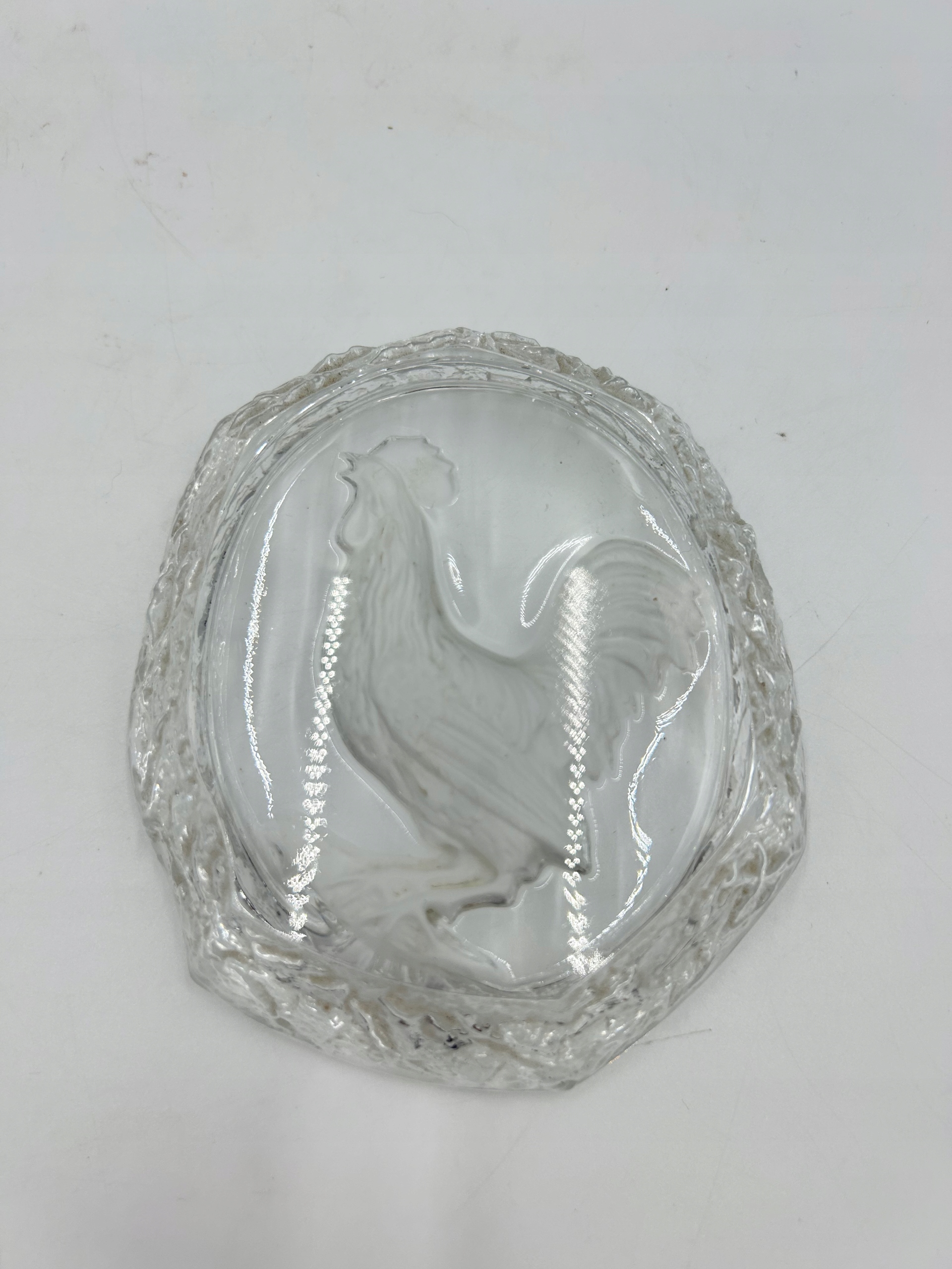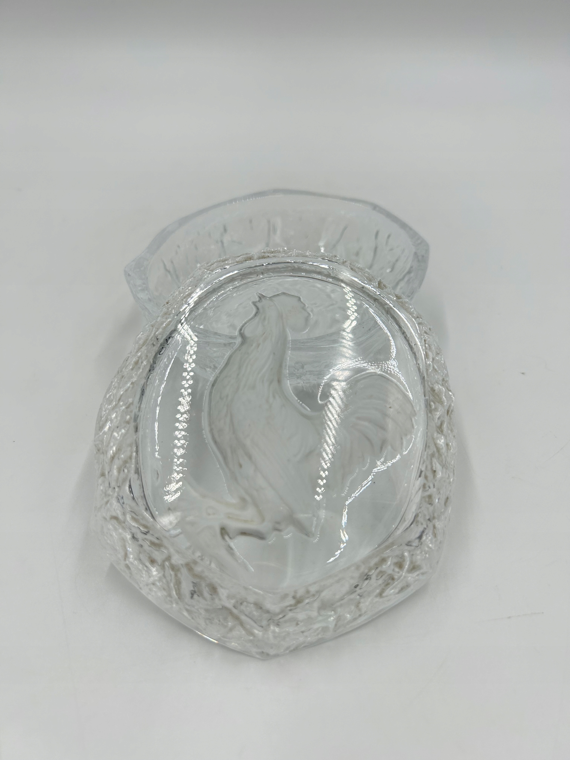 Предмет продажи – шкатулка для мелочей из хрустального стекла. Обложка украшена узором петуха.