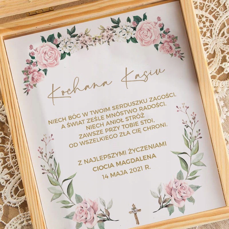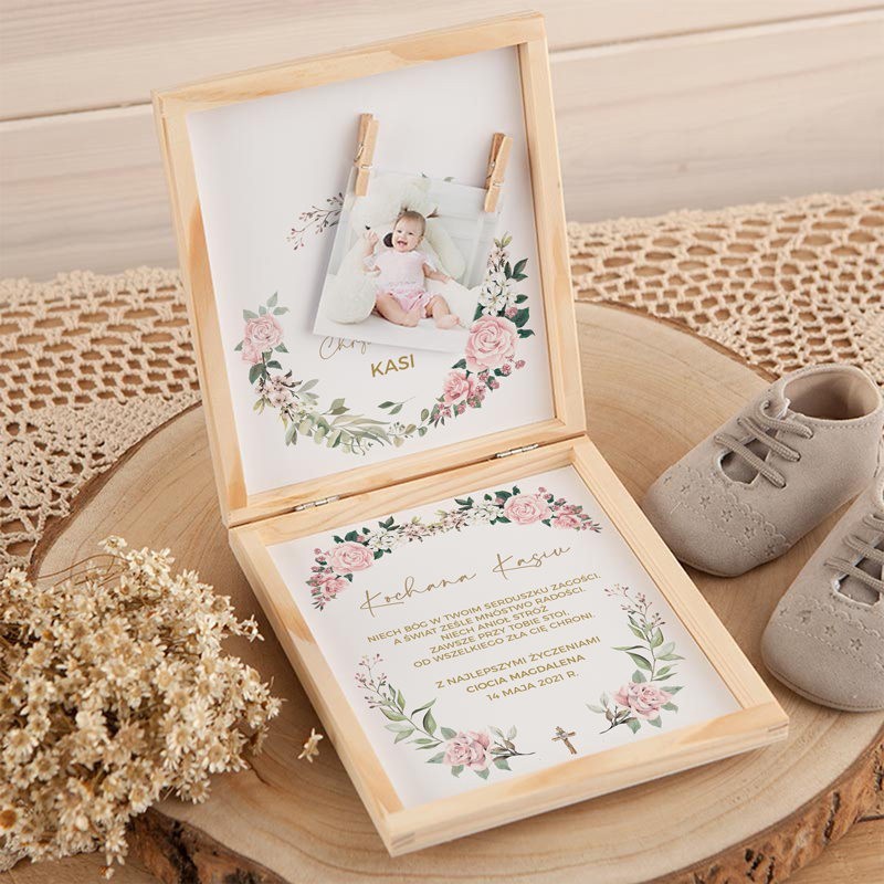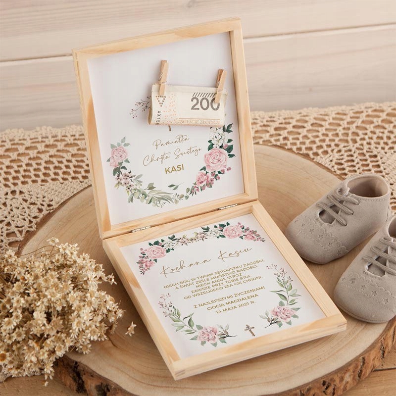 Деревянная крестильная копилка с мотивом деревенского венка — отличная идея, чтобы эстетично подарить ребенку деньги. Коробка станет долговечным сувениром, внутри нее лежат открытки с красивой графикой и индивидуальными пожеланиями. Он может стать постоянным дополнением к подарку.